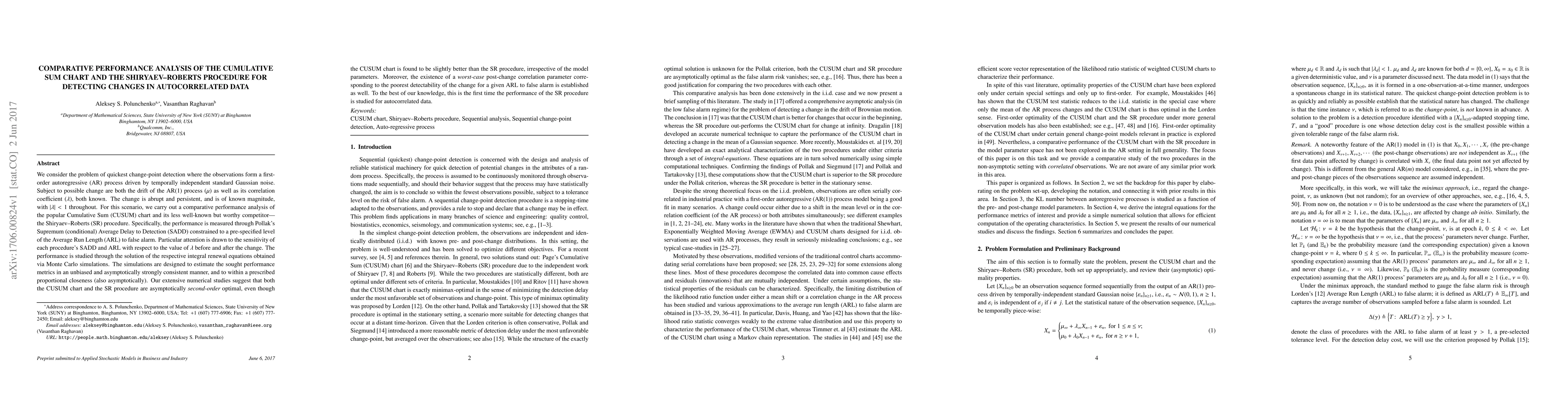 We consider the problem of quickest change-point detection where the observations form a first-order autoregressive (AR) process driven by temporally independent standard Gaussian noise. Subject to possible change are both the drift of the AR(1) process ($\mu$) as well as its correlation coefficient ($\lambda$), both known. The change is abrupt and persistent, and is of known magnitude, with $\vert\lambda\vert<1$ throughout. For this scenario, we carry out a comparative performance analysis of the popular Cumulative Sum (CUSUM) chart and its less well-known but worthy competitor -- the Shiryaev-Roberts (SR) procedure. Specifically, the performance is measured through Pollak's Supremum (conditional) Average Delay to Detection (SADD) constrained to a pre-specified level of the Average Run Length (ARL) to false alarm. Particular attention is drawn to the sensitivity of each procedure's SADD and ARL with respect to the value of $\lambda$ before and after the change. The performance is studied through the solution of the respective integral renewal equations obtained via Monte Carlo simulations. The simulations are designed to estimate the sought performance metrics in an unbiased and asymptotically strongly consistent manner, and to within a prescribed proportional closeness (also asymptotically). Our extensive numerical studies suggest that both the CUSUM chart and the SR procedure are asymptotically second-order optimal, even though the CUSUM chart is found to be slightly better than the SR procedure, irrespective of the model parameters. Moreover, the existence of a worst-case post-change correlation parameter corresponding to the poorest detectability of the change for a given ARL to false alarm is established as well. To the best of our knowledge, this is the first time the performance of the SR procedure is studied for autocorrelated data.