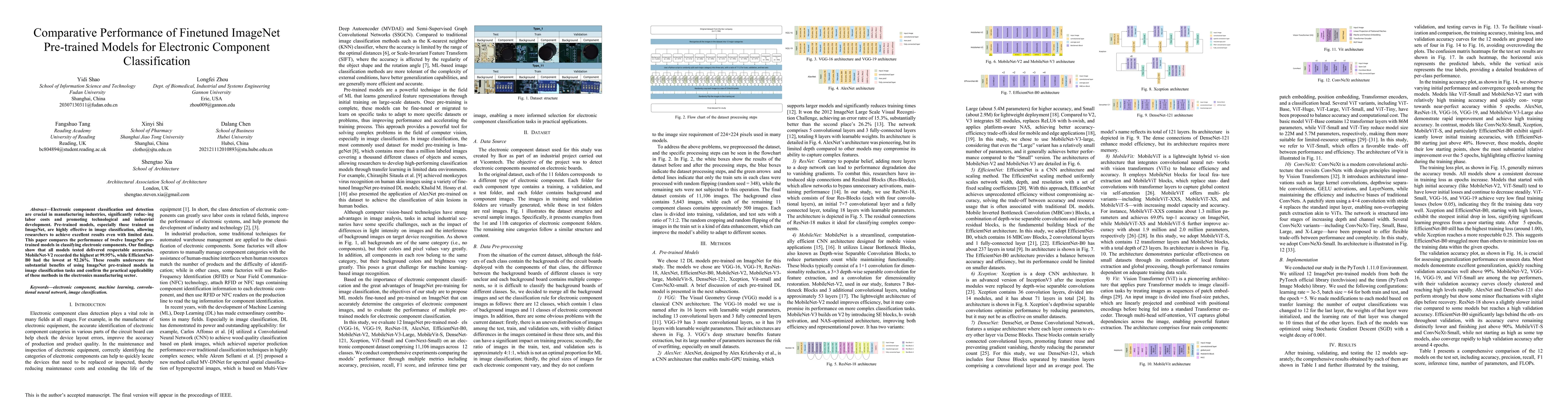 Electronic component classification and detection are crucial in manufacturing industries, significantly reducing labor costs and promoting technological and industrial development. Pre-trained models, especially those trained on ImageNet, are highly effective in image classification, allowing researchers to achieve excellent results even with limited data. This paper compares the performance of twelve ImageNet pre-trained models in classifying electronic components. Our findings show that all models tested delivered respectable accuracies. MobileNet-V2 recorded the highest at 99.95%, while EfficientNet-B0 had the lowest at 92.26%. These results underscore the substantial benefits of using ImageNet pre-trained models in image classification tasks and confirm the practical applicability of these methods in the electronics manufacturing sector.