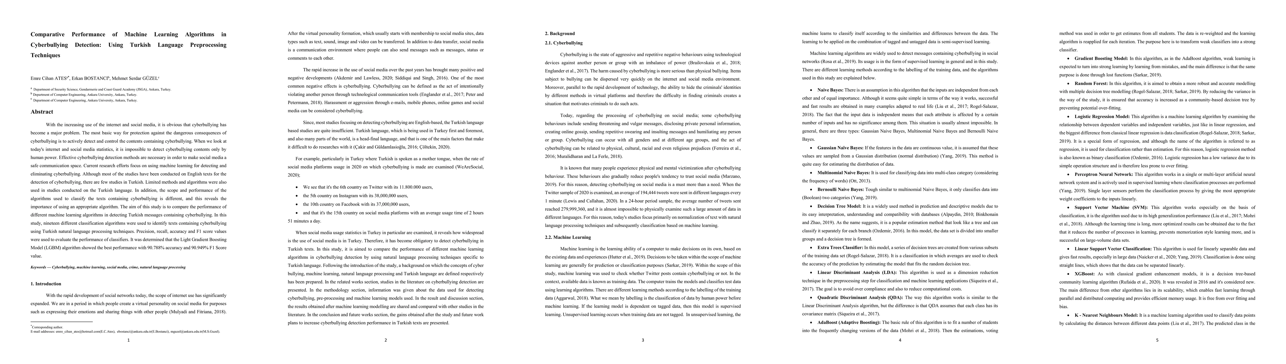 This study compares 19 machine learning algorithms in detecting Turkish cyberbullying messages using natural language processing techniques, finding that Light Gradient Boosting Model (LGBM) achieves the best performance with 90.788% accuracy.