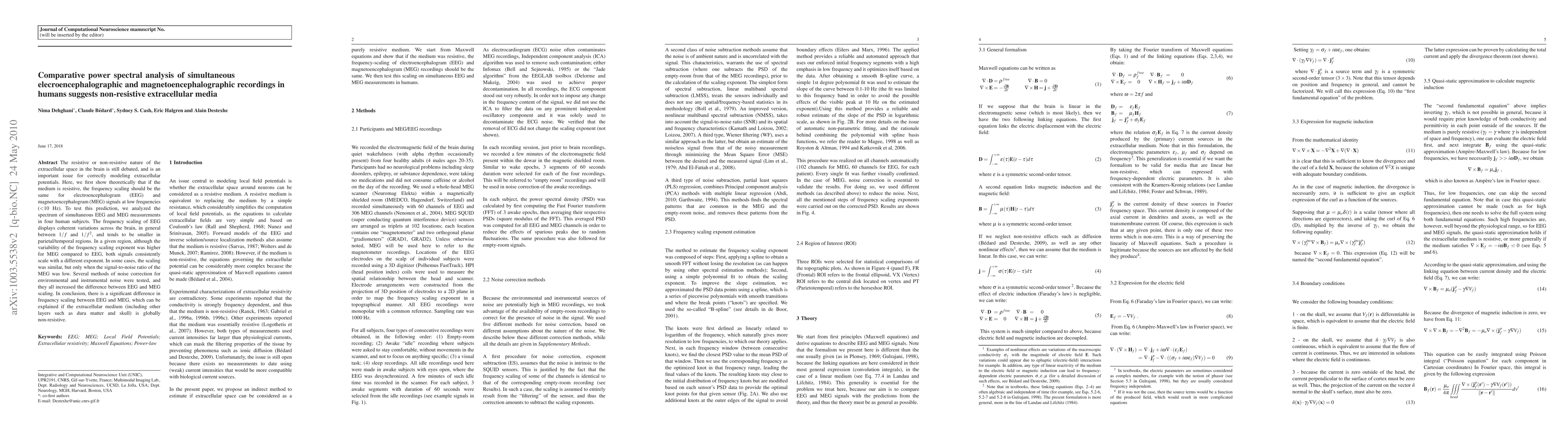 This paper investigates the resistive or non-resistive nature of the brain's extracellular space by comparing EEG and MEG power spectral analyses. The findings suggest that the different frequency scaling between EEG and MEG supports a non-resistive extracellular medium.