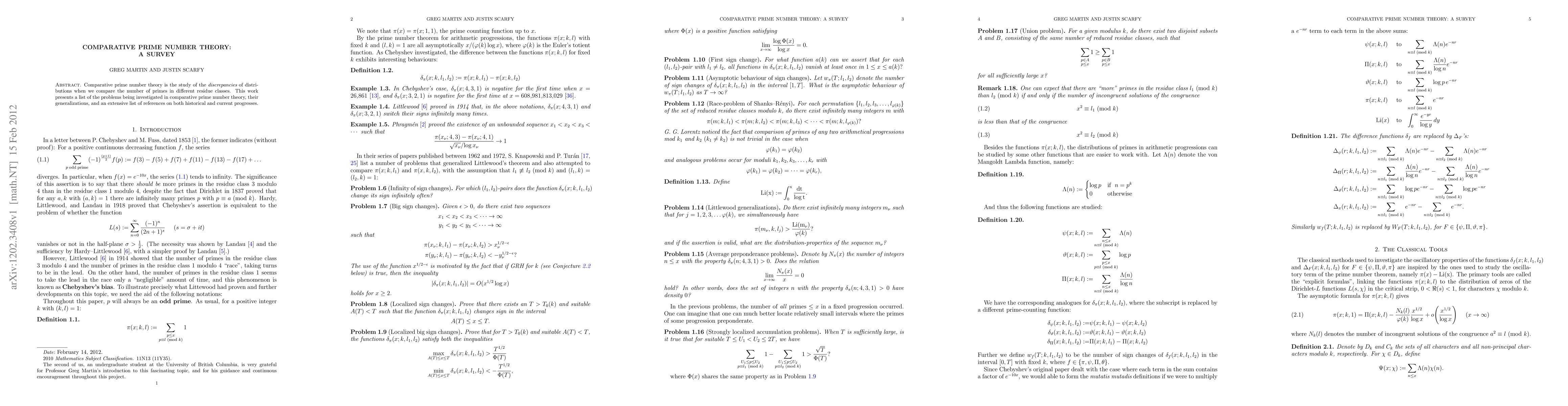 This paper surveys comparative prime number theory, focusing on discrepancies in prime distributions across different residue classes, and provides an extensive list of problems, their generalizations, and references on historical and current progress.
