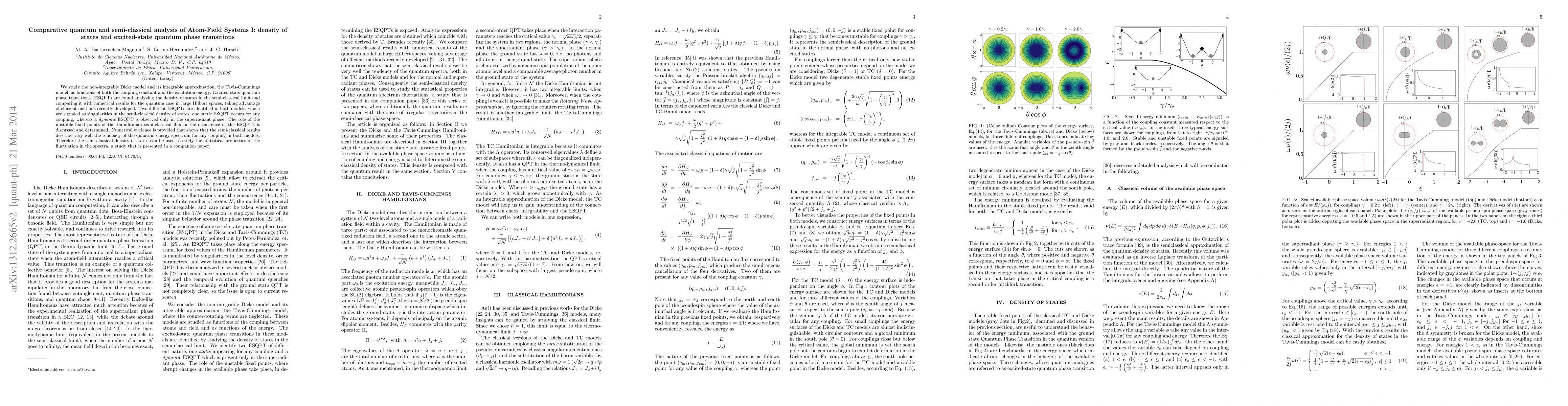 We study the non-integrable Dicke model, and its integrable approximation, the Tavis-Cummings model, as functions of both the coupling constant and the excitation energy. Excited-state quantum phase transitions (ESQPT) are found analyzing the density of states in the semi-classical limit and comparing it with numerical results for the quantum case in large Hilbert spaces, taking advantage of efficient methods recently developed. Two different ESQPTs are identified in both models, which are signaled as singularities in the semi-classical density of states, one {\em static} ESQPT occurs for any coupling, whereas a dynamic ESQPT is observed only in the superradiant phase. The role of the unstable fixed points of the Hamiltonian semi-classical flux in the occurrence of the ESQPTs is discussed and determined. Numerical evidence is provided that shows that the semi-classical result describes very well the tendency of the quantum energy spectrum for any coupling in both models. Therefore the semi-classical density of states can be used to study the statistical properties of the fluctuation in the spectra, a study that is presented in a companion paper.