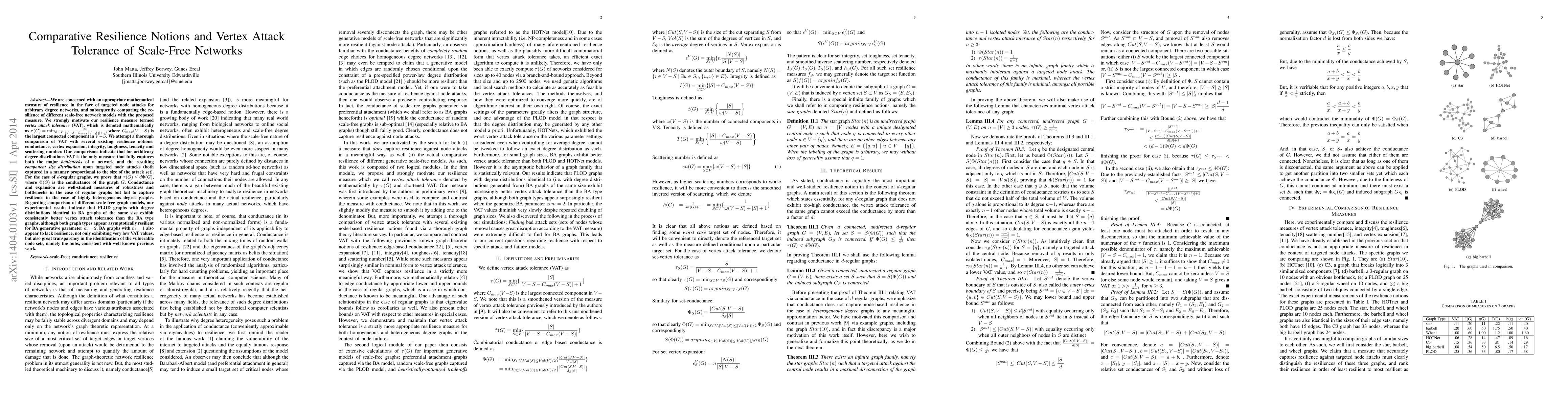 We are concerned with an appropriate mathematical measure of resilience in the face of targeted node attacks for arbitrary degree networks, and subsequently comparing the resilience of different scale-free network models with the proposed measure. We strongly motivate our resilience measure termed \emph{vertex attack tolerance} (VAT), which is denoted mathematically as $\tau(G) = \min_{S \subset V} \frac{|S|}{|V-S-C_{max}(V-S)|+1}$, where $C_{max}(V-S)$ is the largest connected component in $V-S$. We attempt a thorough comparison of VAT with several existing resilience notions: conductance, vertex expansion, integrity, toughness, tenacity and scattering number. Our comparisons indicate that for artbitrary degree distributions VAT is the only measure that fully captures both the major \emph{bottlenecks} of a network and the resulting \emph{component size distribution} upon targeted node attacks (both captured in a manner proportional to the size of the attack set). For the case of $d$-regular graphs, we prove that $\tau(G) \le d\Phi(G)$, where $\Phi(G)$ is the conductance of the graph $G$. Conductance and expansion are well-studied measures of robustness and bottlenecks in the case of regular graphs but fail to capture resilience in the case of highly heterogeneous degree graphs. Regarding comparison of different scale-free graph models, our experimental results indicate that PLOD graphs with degree distributions identical to BA graphs of the same size exhibit consistently better vertex attack tolerance than the BA type graphs, although both graph types appear asymptotically resilient for BA generative parameter $m = 2$. BA graphs with $m = 1$ also appear to lack resilience, not only exhibiting very low VAT values, but also great transparency in the identification of the vulnerable node sets, namely the hubs, consistent with well known previous work.