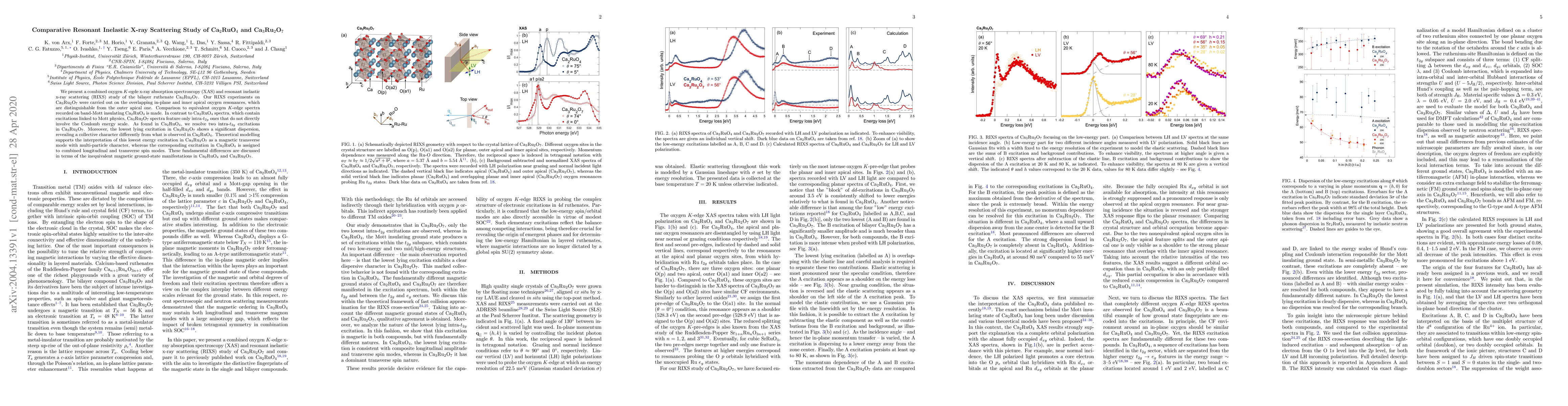 This paper compares the resonant inelastic X-ray scattering (RIXS) spectra of Ca$_2$RuO$_4$ and Ca$_3$Ru$_2$O$_7$, revealing that while Ca$_2$RuO$_4$ exhibits excitations linked to Mott physics, Ca$_3$Ru$_2$O$_7$ shows only intra-$t_{2g}$ excitations without direct Coulomb energy involvement. The lowest energy excitation in Ca$_3$Ru$_2$O$_7$ exhibits significant dispersion, indicating a collective magnetic transverse mode, contrasting with the combined spin modes in Ca$_2$RuO$_4$.