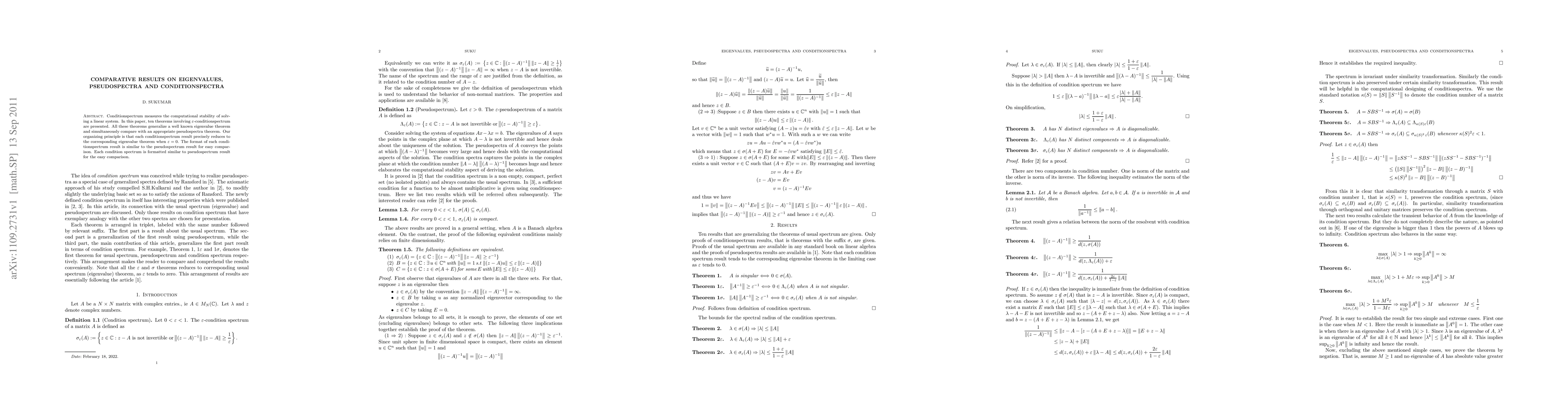 This paper presents ten theorems on the computational stability of solving linear systems, focusing on conditionspectrum measures. Each theorem generalizes a known eigenvalue theorem and compares it to a pseudospectrum theorem, with a special emphasis on the relationship when {\epsilon} equals zero.