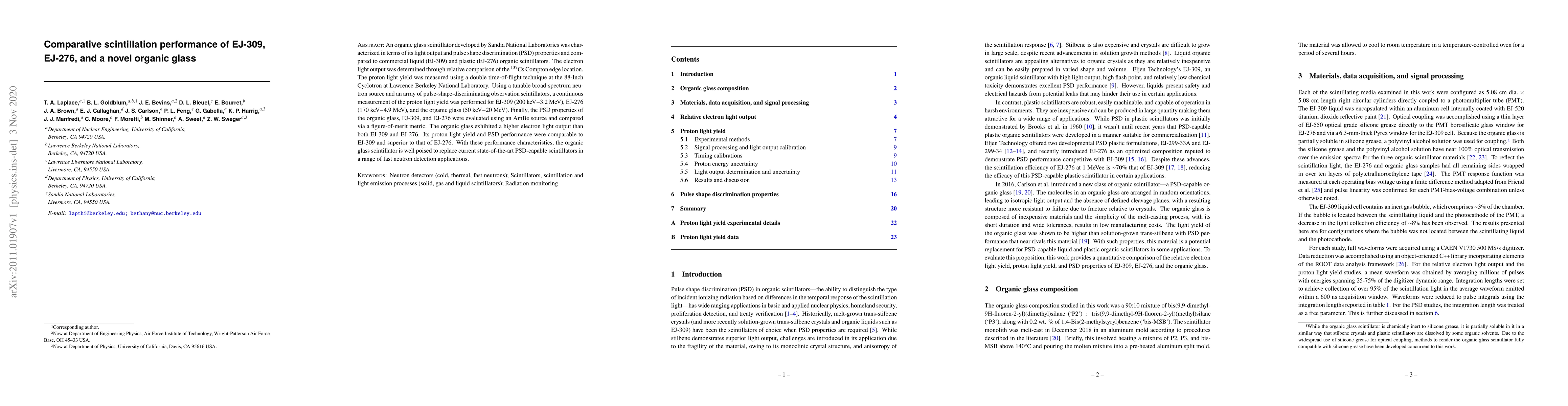 An organic glass scintillator developed by Sandia National Laboratories was characterized in terms of its light output and pulse shape discrimination (PSD) properties and compared to commercial liquid (EJ-309) and plastic (EJ-276) organic scintillators. The electron light output was determined through relative comparison of the $^{137}$Cs Compton edge location. The proton light yield was measured using a double time-of-flight technique at the 88-Inch Cyclotron at Lawrence Berkeley National Laboratory. Using a tunable broad-spectrum neutron source and an array of pulse-shape-discriminating observation scintillators, a continuous measurement of the proton light yield was performed for EJ-309 (200 keV$-$3.2 MeV), EJ-276 (170 keV$-$4.9 MeV), and the organic glass (50 keV$-$20 MeV). Finally, the PSD properties of the organic glass, EJ-309, and EJ-276 were evaluated using an AmBe source and compared via a figure-of-merit metric. The organic glass exhibited a higher electron light output than both EJ-309 and EJ-276. Its proton light yield and PSD performance were comparable to EJ-309 and superior to that of EJ-276. With these performance characteristics, the organic glass scintillator is well poised to replace current state-of-the-art PSD-capable scintillators in a range of fast neutron detection applications.