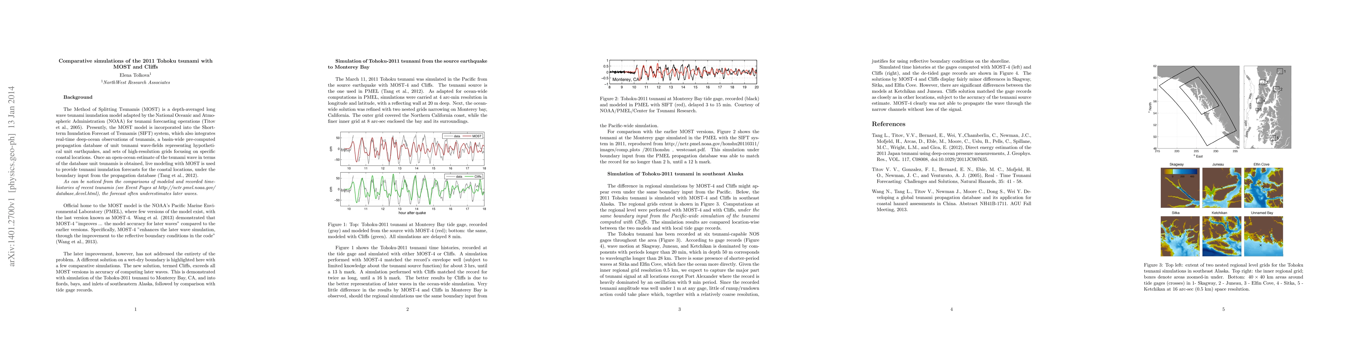 This paper compares tsunami simulations of the 2011 Tohoku event using the MOST model and a new Cliffs solution, highlighting the wet-dry interface's role in improving MOST's accuracy. Cliffs outperforms all MOST versions in simulating later waves, as demonstrated by simulations to Monterey Bay and southeastern Alaska, corroborated by tide gage records.