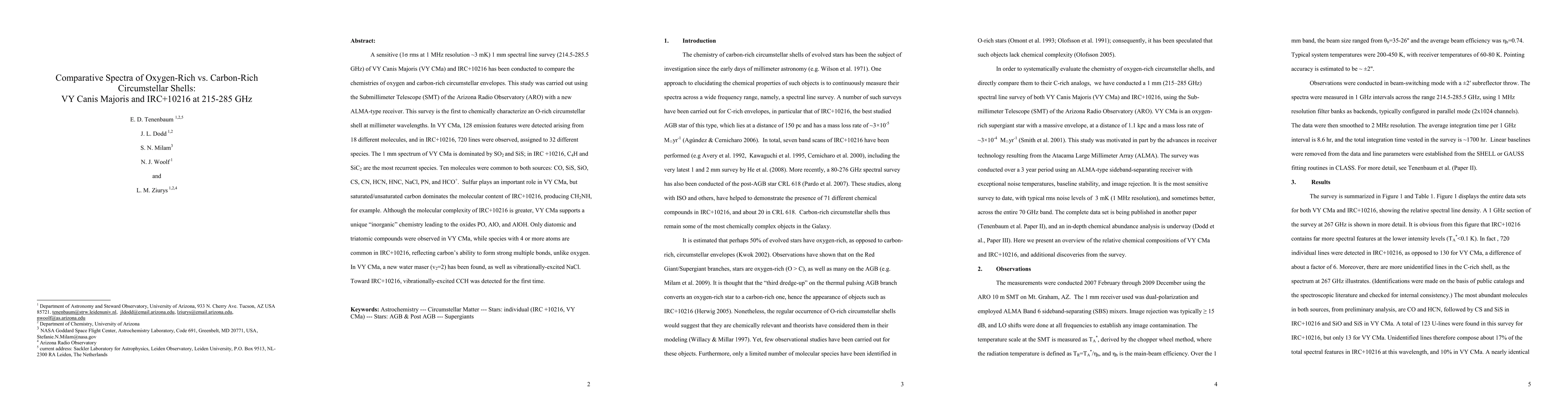 A sensitive (1{\sigma} rms at 1 MHz resolution ~3 mK) 1 mm spectral line survey (214.5-285.5 GHz) of VY Canis Majoris (VY CMa) and IRC+10216 has been conducted to compare the chemistries of oxygen and carbon-rich circumstellar envelopes. This study was carried out using the Submillimeter Telescope (SMT) of the Arizona Radio Observatory (ARO) with a new ALMA-type receiver. This survey is the first to chemically characterize an O-rich circumstellar shell at millimeter wavelengths. In VY CMa, 128 emission features were detected arising from 18 different molecules, and in IRC+10216, 720 lines were observed, assigned to 32 different species. The 1 mm spectrum of VY CMa is dominated by SO2 and SiS; in IRC +10216, C4H and SiC2 are the most recurrent species. Ten molecules were common to both sources: CO, SiS, SiO, CS, CN, HCN, HNC, NaCl, PN, and HCO+. Sulfur plays an important role in VY CMa, but saturated/unsaturated carbon dominates the molecular content of IRC+10216, producing CH2NH, for example. Although the molecular complexity of IRC+10216 is greater, VY CMa supports a unique "inorganic" chemistry leading to the oxides PO, AlO, and AlOH. Only diatomic and triatomic compounds were observed in VY CMa, while species with 4 or more atoms are common in IRC+10216, reflecting carbon's ability to form strong multiple bonds, unlike oxygen. In VY CMa, a new water maser (v_2=2) has been found, as well as vibrationally-excited NaCl. Toward IRC+10216, vibrationally-excited CCH was detected for the first time.