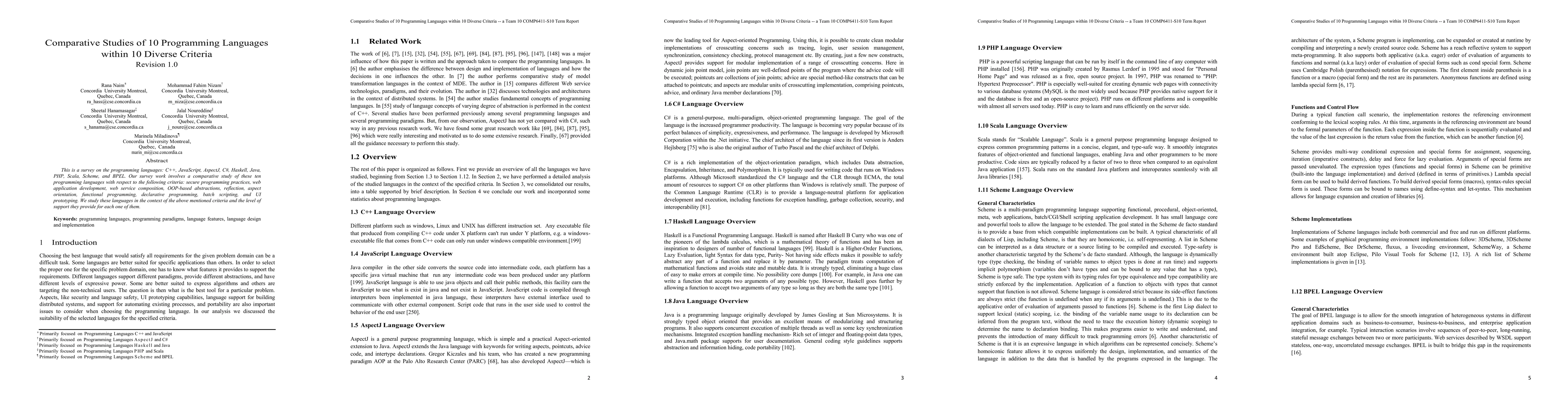 This report surveys ten programming languages—C++, JavaScript, AspectJ, C#, Haskell, Java, PHP, Scala, Scheme, and BPEL—comparing their support across ten diverse criteria including secure programming, web application development, and UI prototyping. The study evaluates each language's capabilities in these areas.