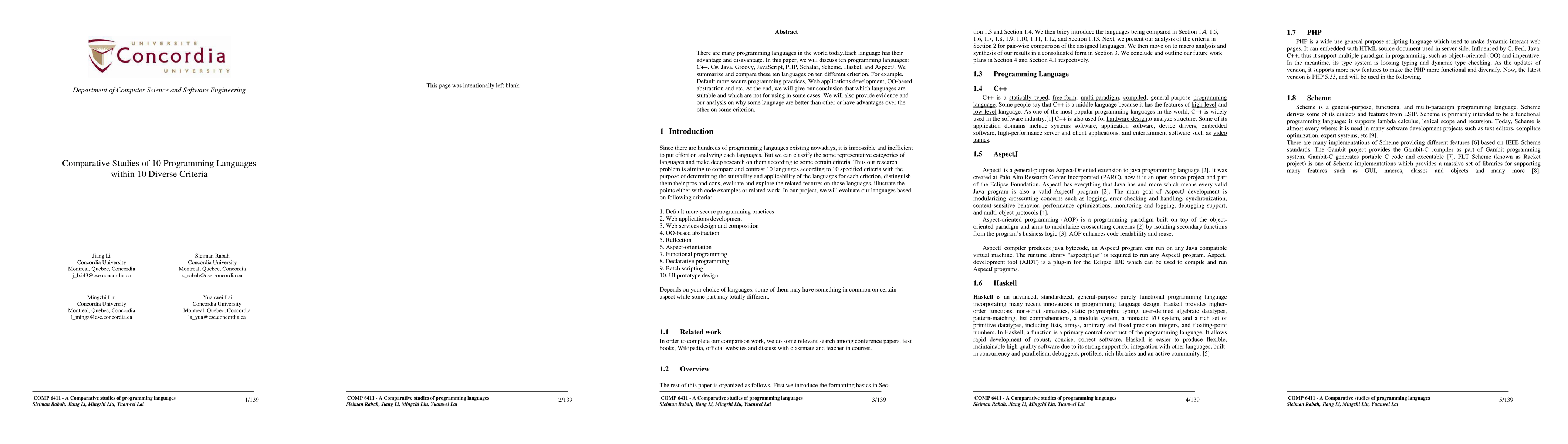 This paper compares ten programming languages—C++, C#, Java, Groovy, JavaScript, PHP, Scala, Scheme, Haskell, and AspectJ—across ten diverse criteria including security, web development, and object-oriented abstraction. The study concludes which languages are most suitable for specific use cases based on comparative analysis and evidence.