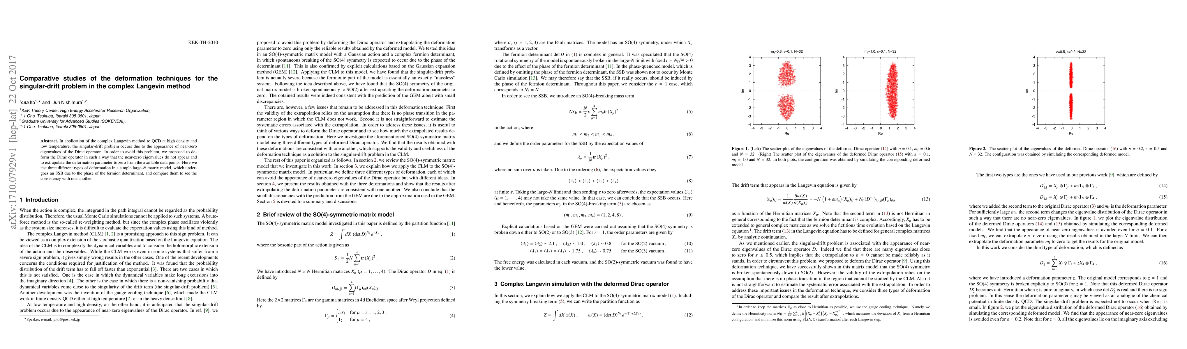 In application of the complex Langevin method to QCD at high density and low temperature, the singular-drift problem occurs due to the appearance of near-zero eigenvalues of the Dirac operator. In order to avoid this problem, we proposed to deform the Dirac operator in such a way that the near-zero eigenvalues do not appear and to extrapolate the deformation parameter to zero from the available data points. Here we test three different types of deformation in a simple large-$N$ matrix model, which undergoes an SSB due to the phase of the fermion determinant, and compare them to see the consistency with one another.