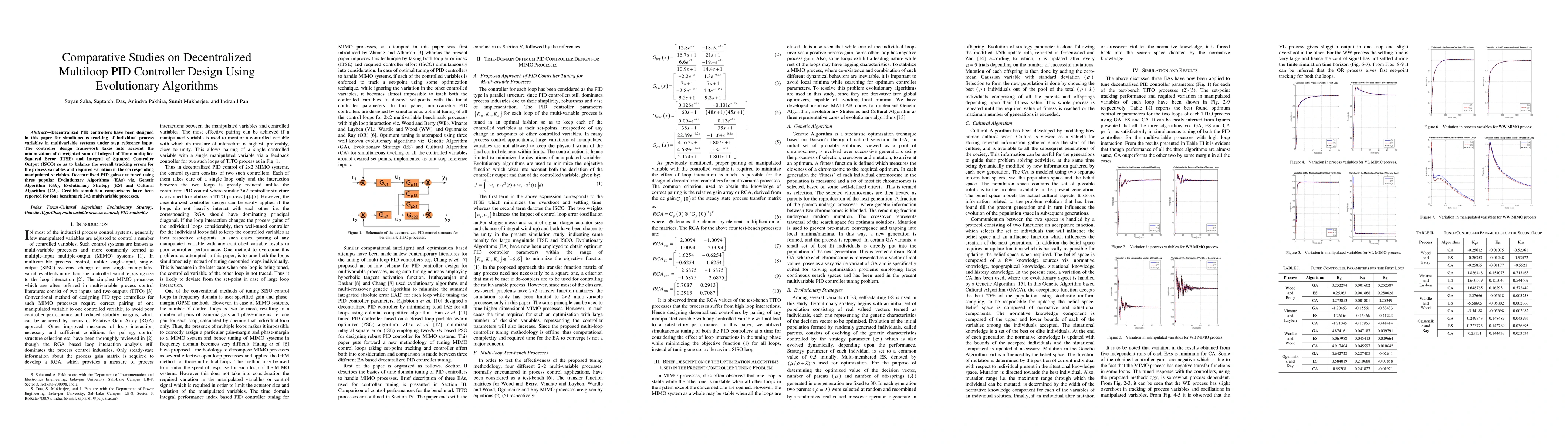 This paper presents decentralized PID controllers for multivariable systems, optimizing tracking errors using Evolutionary Algorithms like Genetic, Evolutionary Strategy, and Cultural Algorithms. The study compares the performance of these algorithms through simulations on benchmark 2x2 processes.