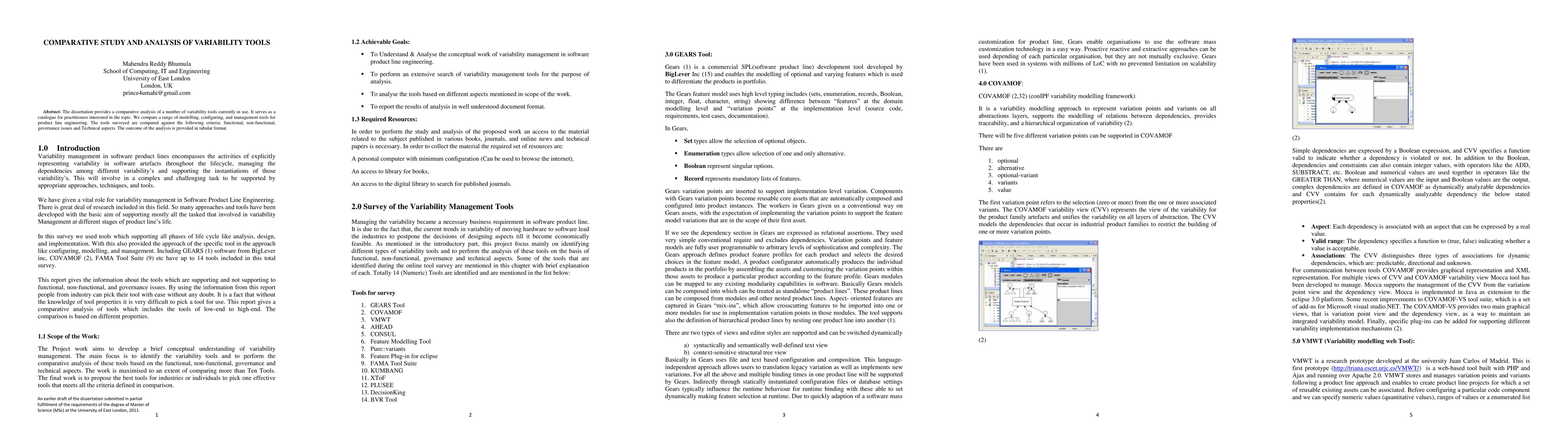 The dissertation provides a comparative analysis of a number of variability tools currently in use. It serves as a catalogue for practitioners interested in the topic. We compare a range of modelling, configuring, and management tools for product line engineering. The tools surveyed are compared against the following criteria: functional, non-functional, governance issues and Technical aspects. The outcome of the analysis is provided in tabular format.