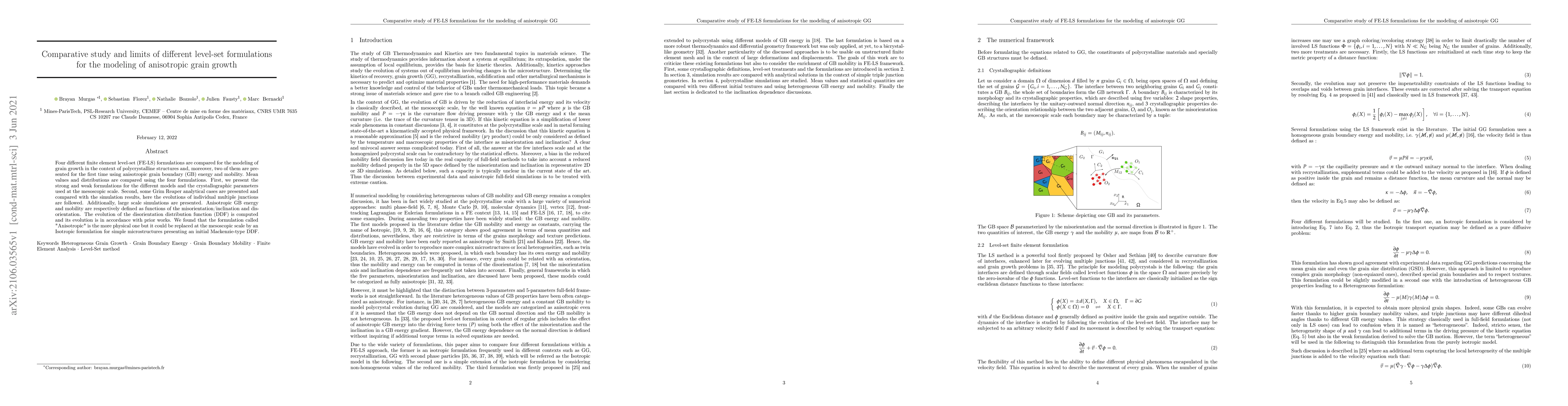 This study compares four finite element level-set formulations for modeling anisotropic grain growth in polycrystalline structures, identifying the "Anisotropic" formulation as the most physically accurate. It finds that an Isotropic formulation can suffice for simple microstructures with an initial Mackenzie-type disorientation distribution function.