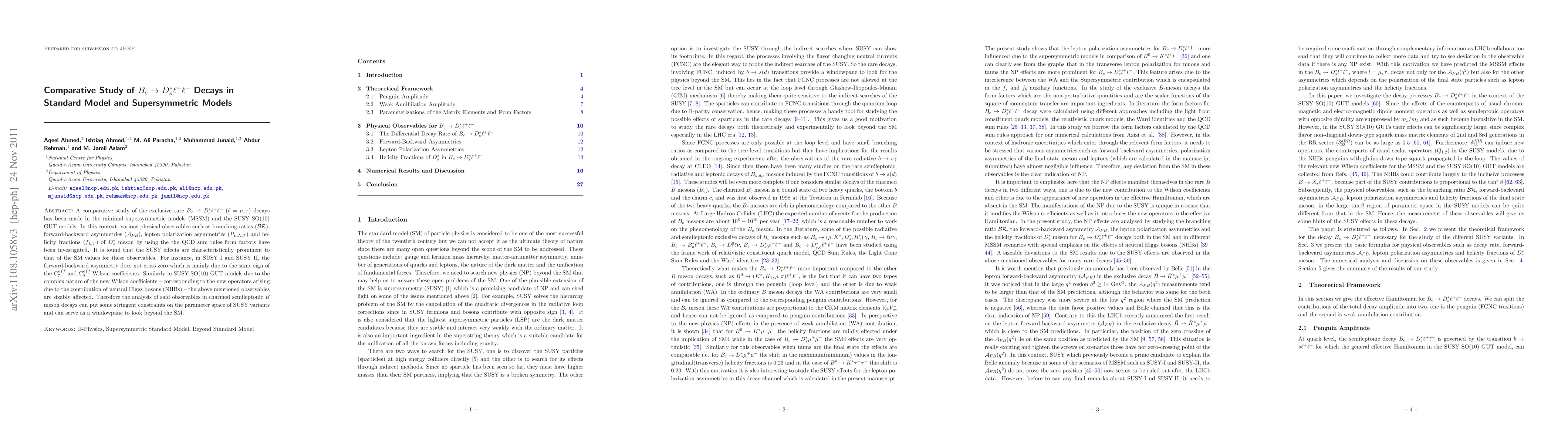 Researchers compared Bc to Ds* l+ l- decays in Standard Model and Supersymmetric Models, finding SUSY effects significantly impact observables like forward-backward asymmetry.