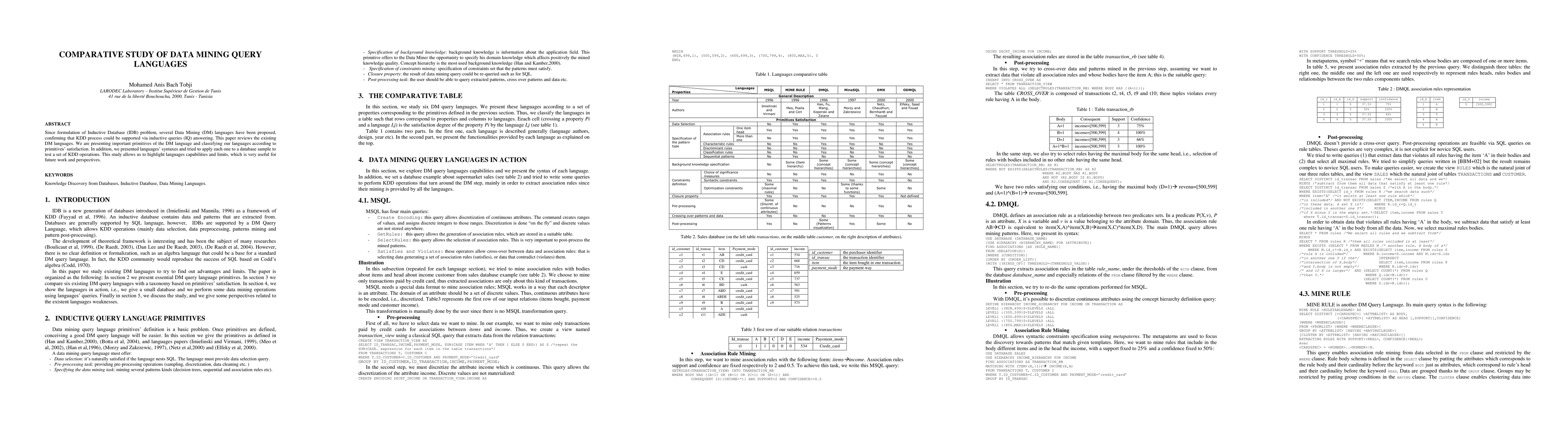 Since formulation of Inductive Database (IDB) problem, several Data Mining (DM) languages have been proposed, confirming that KDD process could be supported via inductive queries (IQ) answering. This paper reviews the existing DM languages. We are presenting important primitives of the DM language and classifying our languages according to primitives' satisfaction. In addition, we presented languages' syntaxes and tried to apply each one to a database sample to test a set of KDD operations. This study allows us to highlight languages capabilities and limits, which is very useful for future work and perspectives.