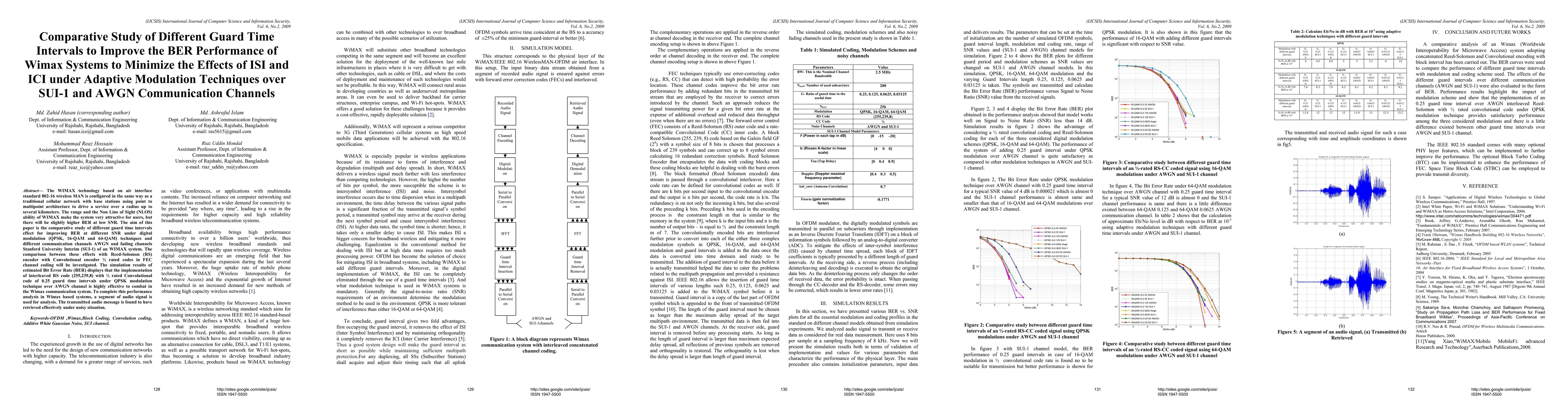 The WIMAX technology based on air interface standard 802.16 wireless MAN is configured in the same way as a traditional cellular network with base stations using point to multipoint architecture to drive a service over a radius up to several kilometers. The range and the Non Line of Sight (NLOS) ability of WIMAX make the system very attractive for users, but there will be slightly higher BER at low SNR. The aim of this paper is the comparative study of different guard time intervals effect for improving BER at different SNR under digital modulation (QPSK, 16QAM and 64QAM) techniques and different communication channels AWGN and fading channels Stanford University Interim (SUI 1) of an WIMAX system. The comparison between these effects with Reed-Solomon (RS) encoder with Convolutional encoder (half) rated codes in FEC channel coding will be investigated. The simulation results of estimated Bit Error Rate (BER) displays that the implementation of interleaved RS code (255,239,8) with (half) rated Convolutional code of 0.25 guard time intervals under QPSK modulation technique over AWGN channel is highly effective to combat in the Wimax communication system. To complete this performance analysis in Wimax based systems, a segment of audio signal is used for analysis. The transmitted audio message is found to have retrieved effectively under noisy situation.