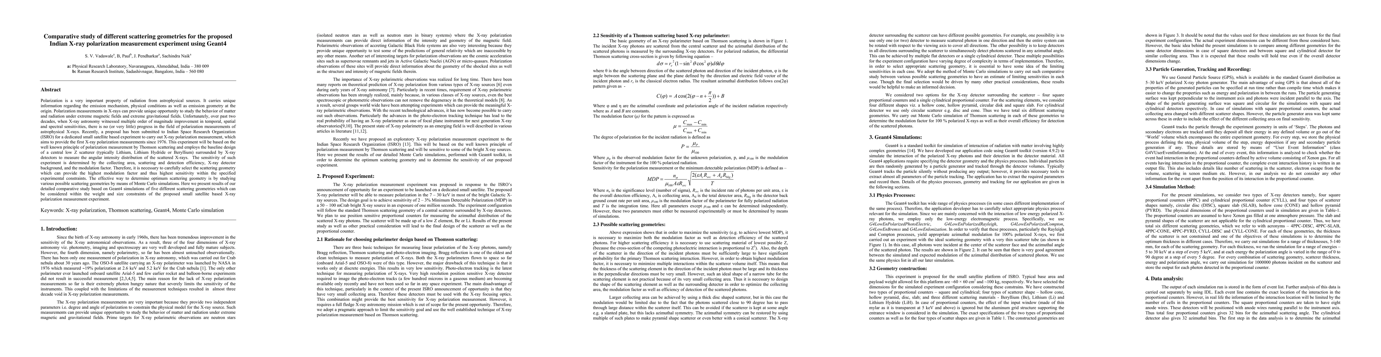 Polarization measurements in X-rays can provide unique opportunity to study the behavior of matter and radiation under extreme magnetic fields and extreme gravitational fields. Unfortunately, over past two decades, when X-ray astronomy witnessed multiple order of magnitude improvement in temporal, spatial and spectral sensitivities, there is no (or very little) progress in the field of polarization measurements of astrophysical X-rays. Recently, a proposal has been submitted to ISRO for a dedicated small satellite based experiment to carry out X-ray polarization measurement, which aims to provide the first X-ray polarization measurements since 1976. This experiment will be based on the well known principle of polarization measurement by Thomson scattering and employs the baseline design of a central low Z scatterer surrounded by X-ray detectors to measure the angular intensity distribution of the scattered X-rays. The sensitivity of such experiment is determined by the collecting area, scattering and detection efficiency, X-ray detector background, and the modulation factor. Therefore, it is necessary to carefully select the scattering geometry which can provide the highest modulation factor and thus highest sensitivity within the specified experimental constraints. The effective way to determine optimum scattering geometry is by studying various possible scattering geometries by means of Monte Carlo simulations. Here we present results of our detailed comparative study based on Geant4 simulations of five different scattering geometries which can be considered within the weight and size constraints of the proposed small satellite based X-ray polarization measurement experiment.
