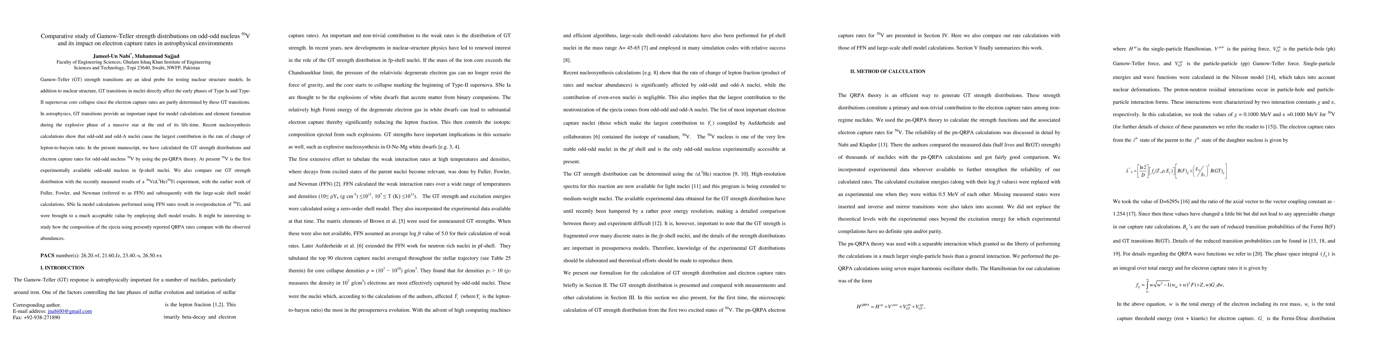Gamow-Teller (GT) strength transitions are an ideal probe for testing nuclear structure models. In addition to nuclear structure, GT transitions in nuclei directly affect the early phases of Type Ia and Type-II supernovae core collapse since the electron capture rates are partly determined by these GT transitions. In astrophysics, GT transitions provide an important input for model calculations and element formation during the explosive phase of a massive star at the end of its life-time. Recent nucleosynthesis calculations show that odd-odd and odd-A nuclei cause the largest contribution in the rate of change of lepton-to-baryon ratio. In the present manuscript, we have calculated the GT strength distributions and electron capture rates for odd-odd nucleus 50V by using the pn-QRPA theory. At present 50V is the first experimentally available odd-odd nucleus in fp-shell nuclei. We also compare our GT strength distribution with the recently measured results of a 50V(d,2He)50Ti experiment, with the earlier work of Fuller, Fowler, and Newman (referred to as FFN) and subsequently with the large-scale shell model calculations. One curious finding of the paper is that the Brink's hypothesis, usually employed in large-scale shell model calculations, is not a good approximation to use at least in the case of 50V. SNe Ia model calculations performed using FFN rates result in overproduction of 50Ti, and were brought to a much acceptable value by employing shell model results. It might be interesting to study how the composition of the ejecta using presently reported QRPA rates compare with the observed abundances.