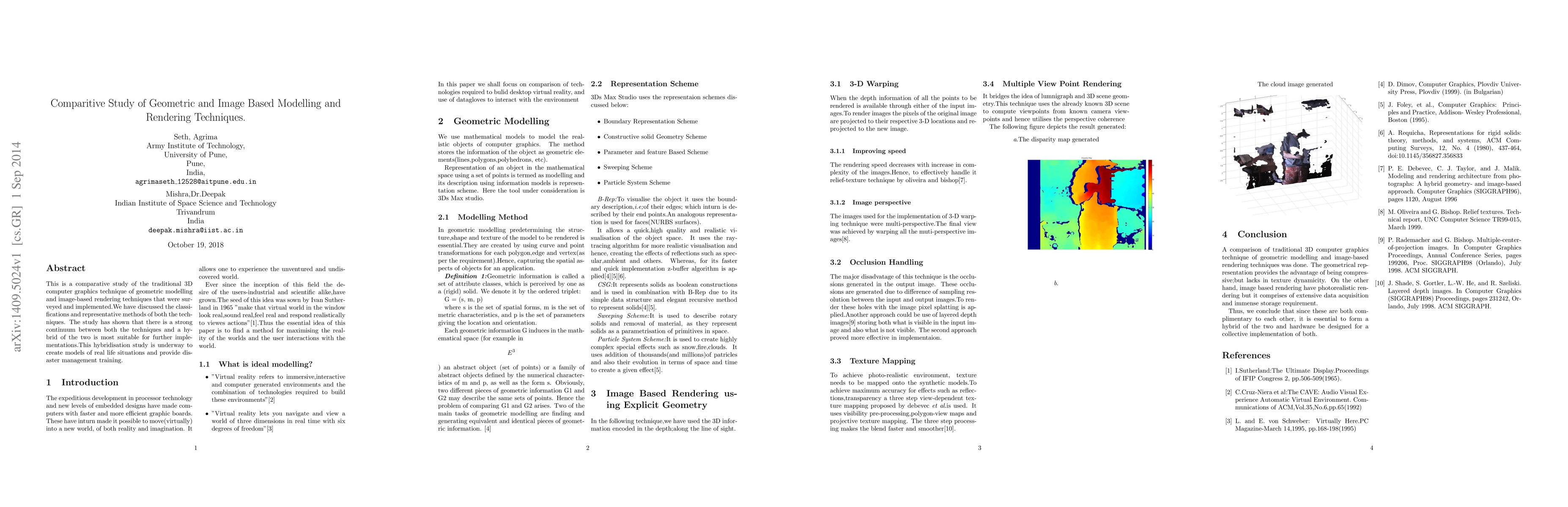This paper compares geometric modelling and image-based rendering techniques, highlighting their classifications and representative methods. The study suggests that a hybrid approach combining both techniques is optimal for future applications, particularly in creating realistic models for disaster management training.