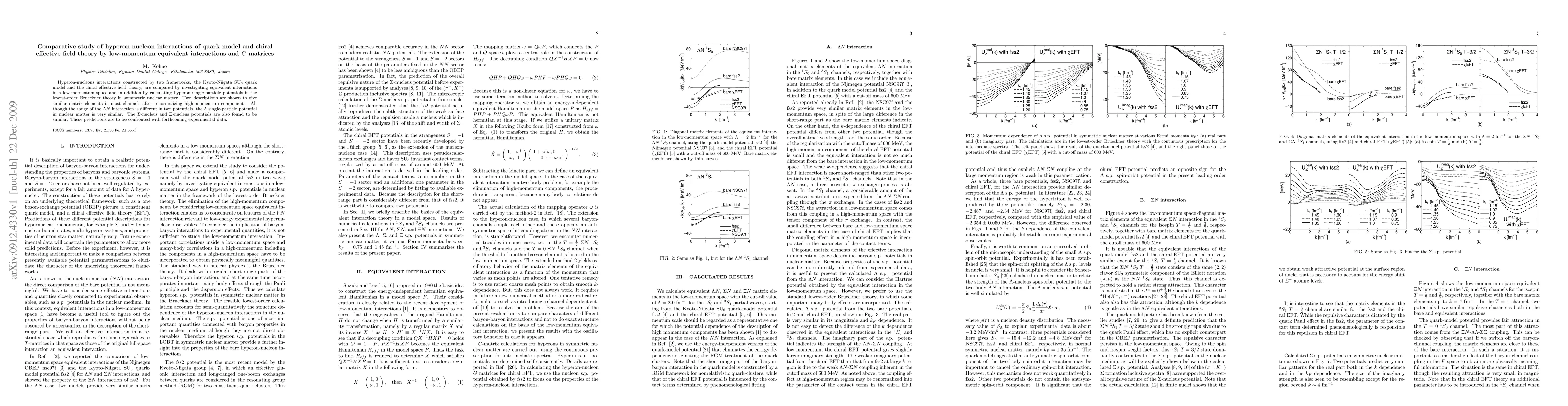 This paper compares hyperon-nucleon interactions derived from the Kyoto-Niigata SU$_6$ quark model and chiral effective field theory, finding similar matrix elements after renormalization. Despite differences in $\Lambda N$ interaction ranges, the $\Lambda$ single-particle potential and $\Sigma$ and $\Xi$ potentials in nuclear matter are remarkably alike, awaiting experimental validation.