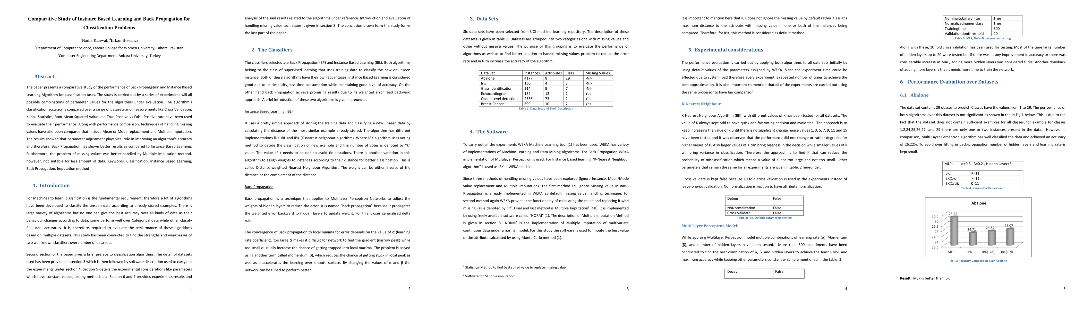 The paper presents a comparative study of the performance of Back Propagation and Instance Based Learning Algorithm for classification tasks. The study is carried out by a series of experiments will all possible combinations of parameter values for the algorithms under evaluation. The algorithm's classification accuracy is compared over a range of datasets and measurements like Cross Validation, Kappa Statistics, Root Mean Squared Value and True Positive vs False Positive rate have been used to evaluate their performance. Along with performance comparison, techniques of handling missing values have also been compared that include Mean or Mode replacement and Multiple Imputation. The results showed that parameter adjustment plays vital role in improving an algorithm's accuracy and therefore, Back Propagation has shown better results as compared to Instance Based Learning. Furthermore, the problem of missing values was better handled by Multiple imputation method, however, not suitable for less amount of data.