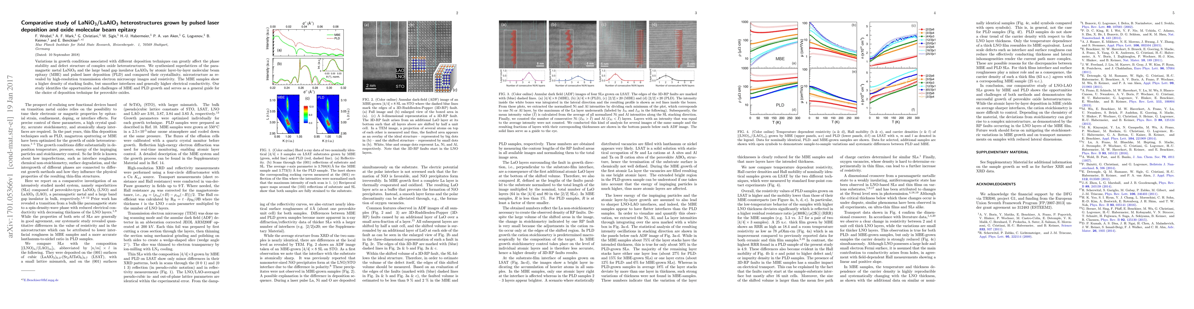Variations in growth conditions associated with different deposition techniques can greatly affect the phase stability and defect structure of complex oxide heterostructures. We synthesized superlattices of the paramagnetic metal LaNiO3 and the large band gap insulator LaAlO3 by atomic layer-by-layer molecular beam epitaxy (MBE) and pulsed laser deposition (PLD) and compared their crystallinity, microstructure as revealed by high-resolution transmission electron microscopy images and resistivity. The MBE samples show a higher density of stacking faults, but smoother interfaces and generally higher electrical conductivity. Our study identifies the opportunities and challenges of MBE and PLD growth and serves as a general guide for the choice of deposition technique for perovskite oxides.