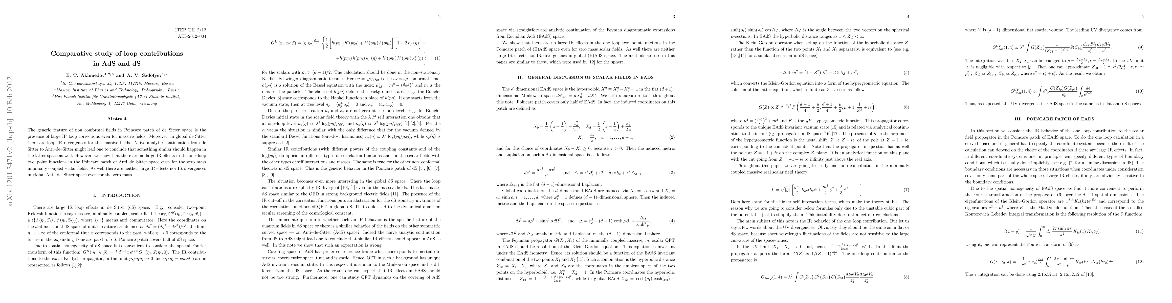 Researchers compare loop contributions in Anti-de-Sitter (AdS) space to de Sitter space and find no large IR effects in AdS for zero-mass fields, contradicting expectations from analytic continuation.