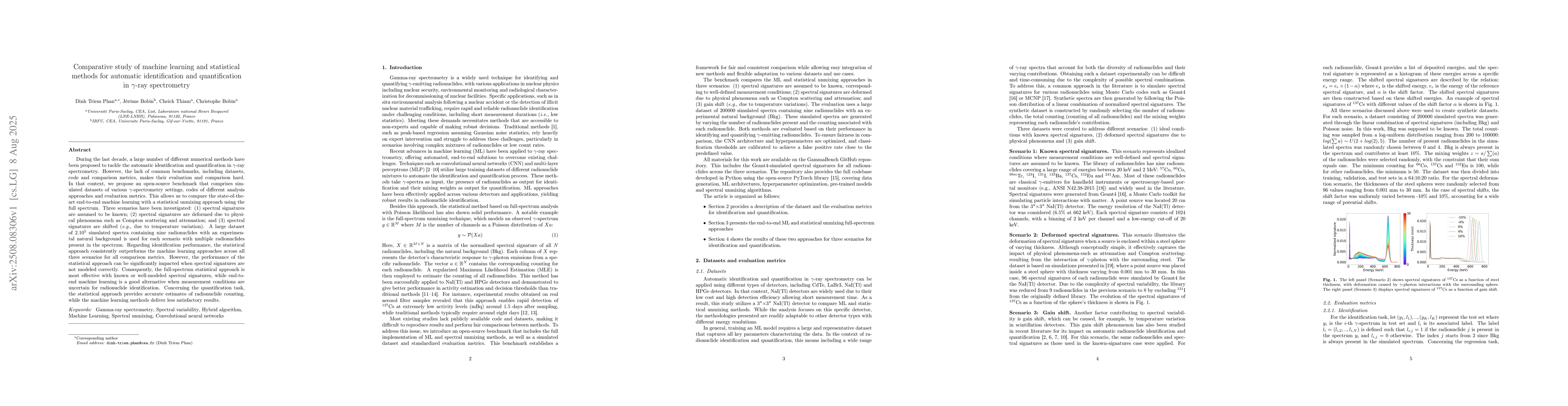 During the last decade, a large number of different numerical methods have been proposed to tackle the automatic identification and quantification in {\gamma}-ray spectrometry. However, the lack of common benchmarks, including datasets, code and comparison metrics, makes their evaluation and comparison hard. In that context, we propose an open-source benchmark that comprises simulated datasets of various {\gamma}-spectrometry settings, codes of different analysis approaches and evaluation metrics. This allows us to compare the state-of-the-art end-to-end machine learning with a statistical unmixing approach using the full spectrum. Three scenarios have been investigated: (1) spectral signatures are assumed to be known; (2) spectral signatures are deformed due to physical phenomena such as Compton scattering and attenuation; and (3) spectral signatures are shifted (e.g., due to temperature variation). A large dataset of 200000 simulated spectra containing nine radionuclides with an experimental natural background is used for each scenario with multiple radionuclides present in the spectrum. Regarding identification performance, the statistical approach consistently outperforms the machine learning approaches across all three scenarios for all comparison metrics. However, the performance of the statistical approach can be significantly impacted when spectral signatures are not modeled correctly. Consequently, the full-spectrum statistical approach is most effective with known or well-modeled spectral signatures, while end-to-end machine learning is a good alternative when measurement conditions are uncertain for radionuclide identification. Concerning the quantification task, the statistical approach provides accurate estimates of radionuclide counting, while the machine learning methods deliver less satisfactory results.
