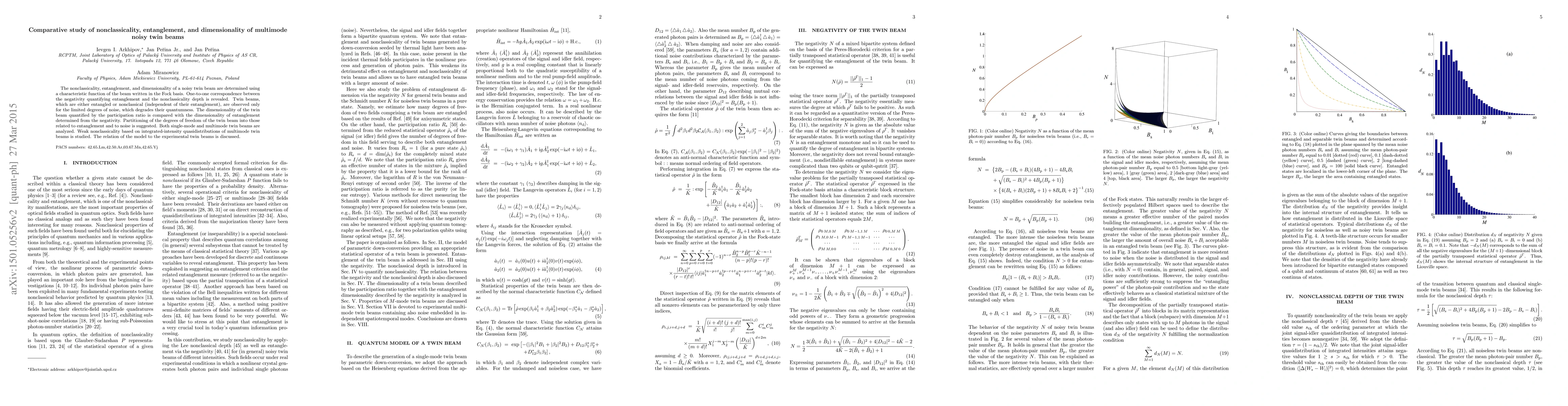 Nonclassicality, entanglement, as well as dimensionality of a noisy twin beam are determined using characteristic function of the beam written in the Fock basis. One-to-one correspondence between the negativity quantifying entanglement and the nonclassicality depth is revealed. Twin beams, which are either entangled or nonclassical (independent of their entanglement), are observed only for the limited degrees of noise that degrades their quantumness. Dimensionality of the twin beam quantified by the participation ratio is compared with the dimensionality of entanglement determined from the negativity. The partition of the degrees of freedom of the twin beam into those related to entanglement and to noise is suggested. Both single-mode and multimode twin beams are analyzed. Weak nonclassicality based on integrated-intensity quasidistributions of multimode twin beams is studied. Relation of the model to the experimental twin beams is discussed.