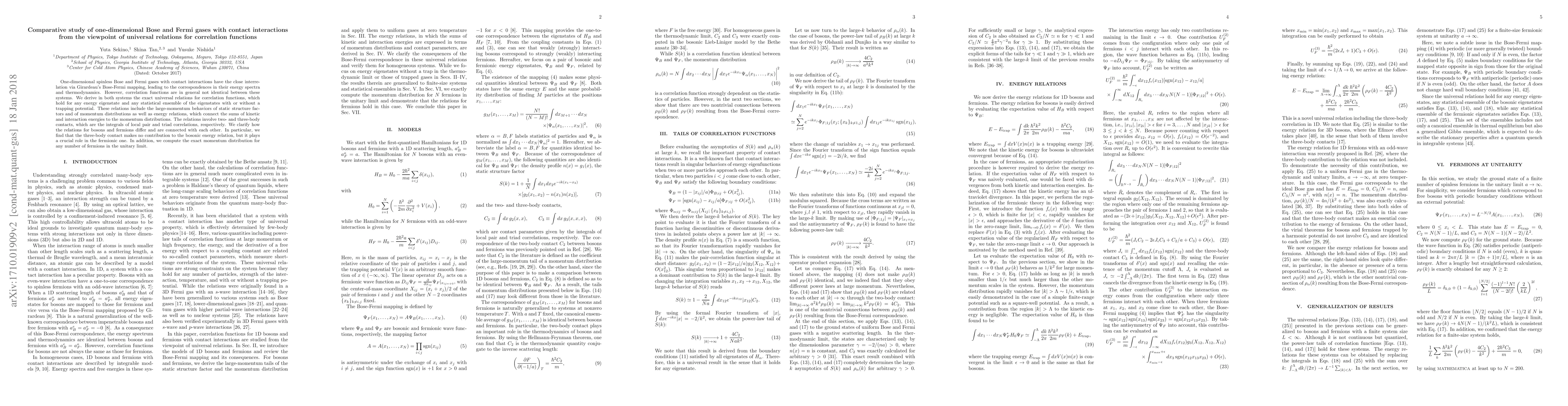 This paper explores universal relations for correlation functions in one-dimensional Bose and Fermi gases with contact interactions, revealing differences and connections via Girardeau's mapping. It finds distinct roles for two- and three-body contacts in the energy relations of bosons and fermions, particularly highlighting the three-body contact's importance in fermionic systems.