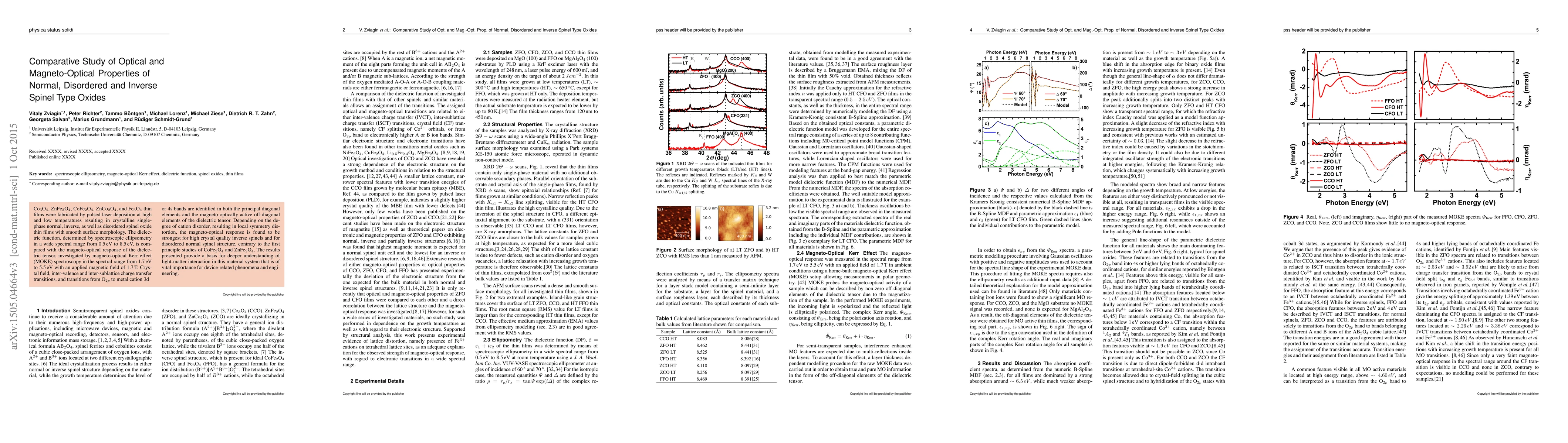 Co$_3$O$_4$, ZnFe$_2$O$_4$, CoFe$_2$O$_4$, ZnCo$_2$O$_4$, and Fe$_3$O$_4$ thin films were fabricated by pulsed laser deposition at high and low temperatures resulting in crystalline single-phase normal, inverse, as well as disordered spinel oxide thin films with smooth surface morphology. The dielectric function, determined by spectroscopic ellipsometry in a wide spectral range from 0.5 eV to 8.5 eV, is compared with the magneto-optical response of the dielectric tensor, investigated by magneto-optical Kerr effect (MOKE) spectroscopy in the spectral range from 1.7 eV to 5.5 eV with an applied magnetic field of 1.7 T. Crystal field, inter-valence and inter-sublattice charge transfer transitions, and transitions from O$_{2p}$ to metal cation 3d or 4s bands are identified in both the principal diagonal elements and the magneto-optically active off-diagonal elements of the dielectric tensor. Depending on the degree of cation disorder, resulting in local symmetry distortion, the magneto-optical response is found to be strongest for high crystal quality inverse spinels and for disordered normal spinel structure, contrary to the first principle studies of CoFe$_2$O$_4$ and ZnFe$_2$O$_4$. The results presented provide a basis for deeper understanding of light-matter interaction in this material system that is of vital importance for device-related phenomena and engineering.