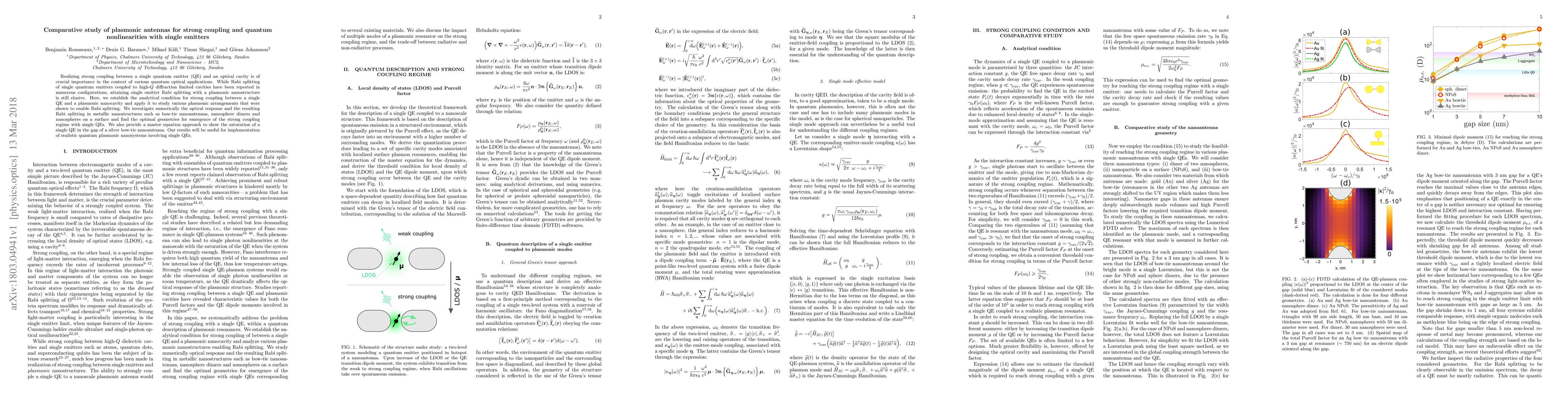 This paper investigates conditions for strong coupling between single quantum emitters and plasmonic nanostructures, exploring various configurations to achieve optimal geometries for Rabi splitting. The study provides a numerical analysis of plasmonic antennas, including bow-tie nanoantennas and nanosphere dimers, and presents a master equation approach for understanding saturation in quantum plasmonic systems.