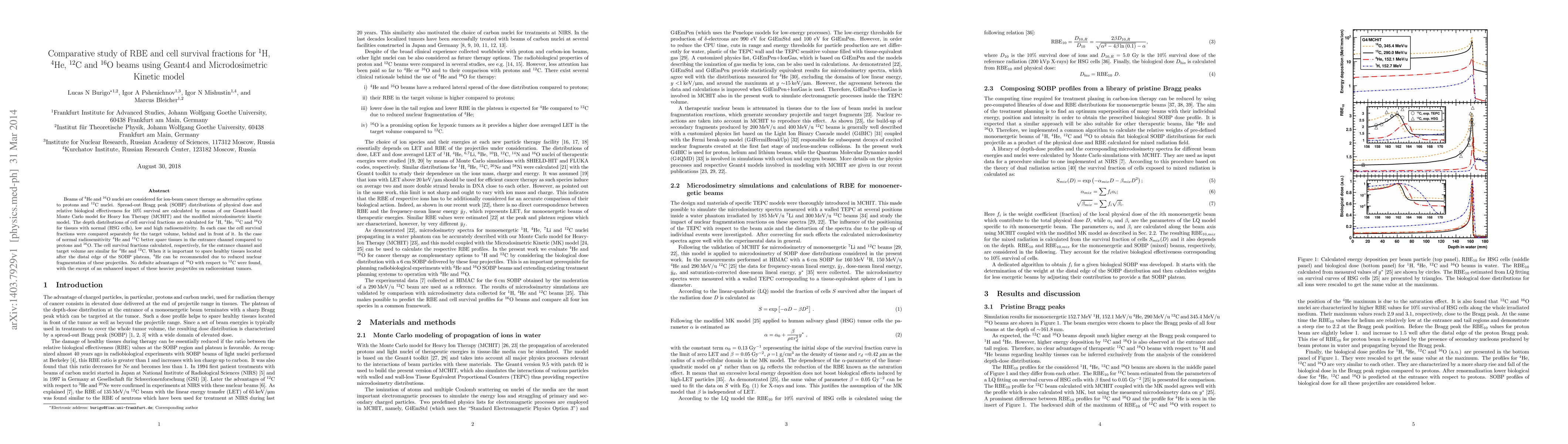 This paper compares the relative biological effectiveness (RBE) and cell survival fractions for proton, helium, carbon, and oxygen beams in ion-beam cancer therapy using Geant4 simulations and a microdosimetric kinetic model. It finds that helium and carbon beams better spare normal tissues compared to protons and oxygen, with helium showing reduced nuclear fragmentation for tissues behind the spread-out Bragg peak.