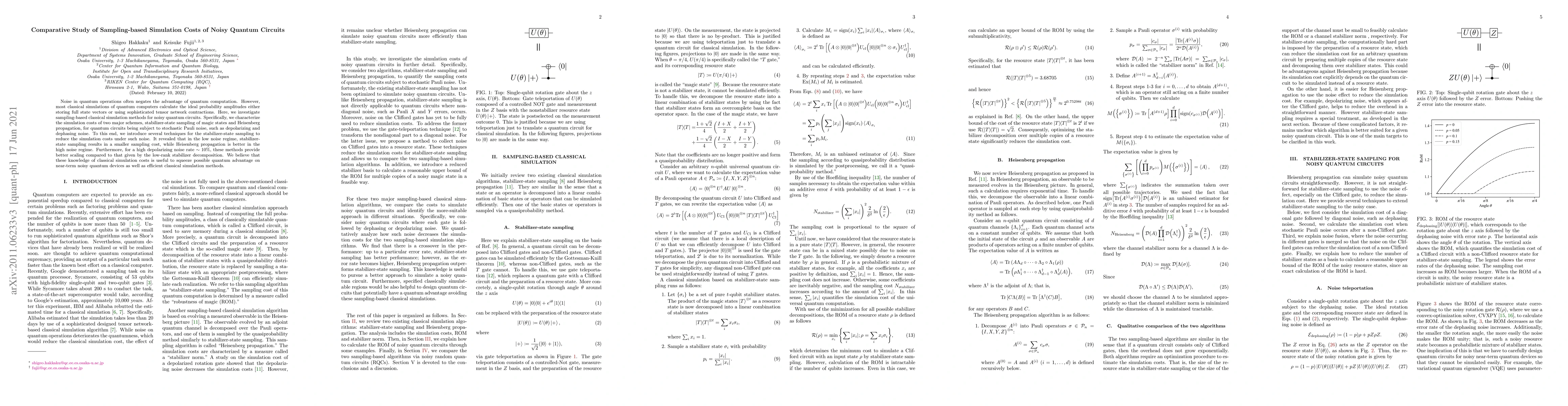 This paper compares the simulation costs of two classical methods for noisy quantum circuits: stabilizer-state sampling and Heisenberg propagation. It finds that stabilizer-state sampling is more efficient in low noise conditions, while Heisenberg propagation is better under high noise, providing insights for both quantum advantage and efficient classical simulation.