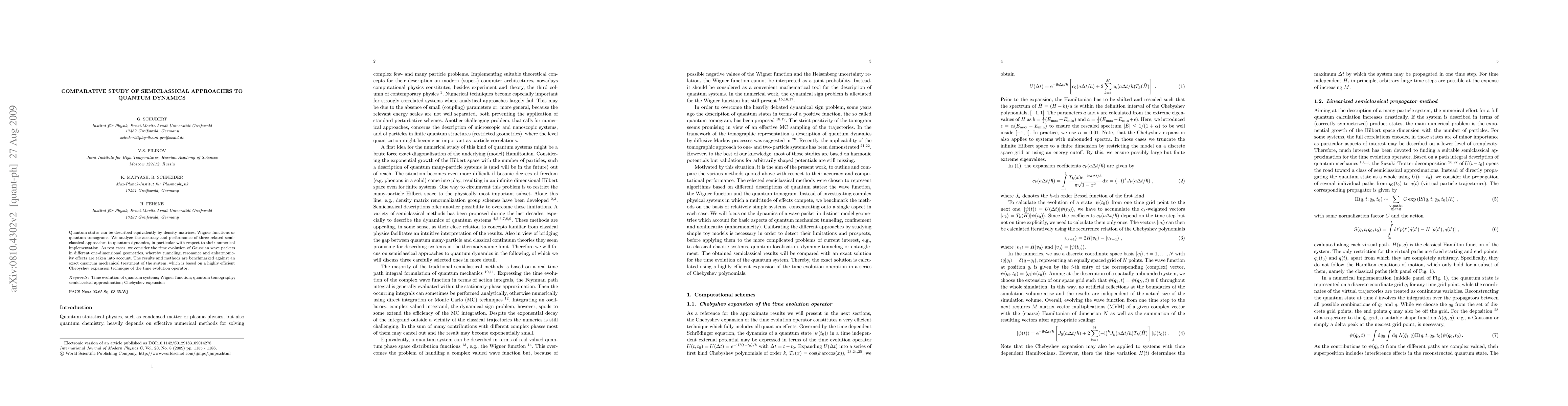 Quantum states can be described equivalently by density matrices, Wigner functions or quantum tomograms. We analyze the accuracy and performance of three related semiclassical approaches to quantum dynamics, in particular with respect to their numerical implementation. As test cases, we consider the time evolution of Gaussian wave packets in different one-dimensional geometries, whereby tunneling, resonance and anharmonicity effects are taken into account. The results and methods are benchmarked against an exact quantum mechanical treatment of the system, which is based on a highly efficient Chebyshev expansion technique of the time evolution operator.