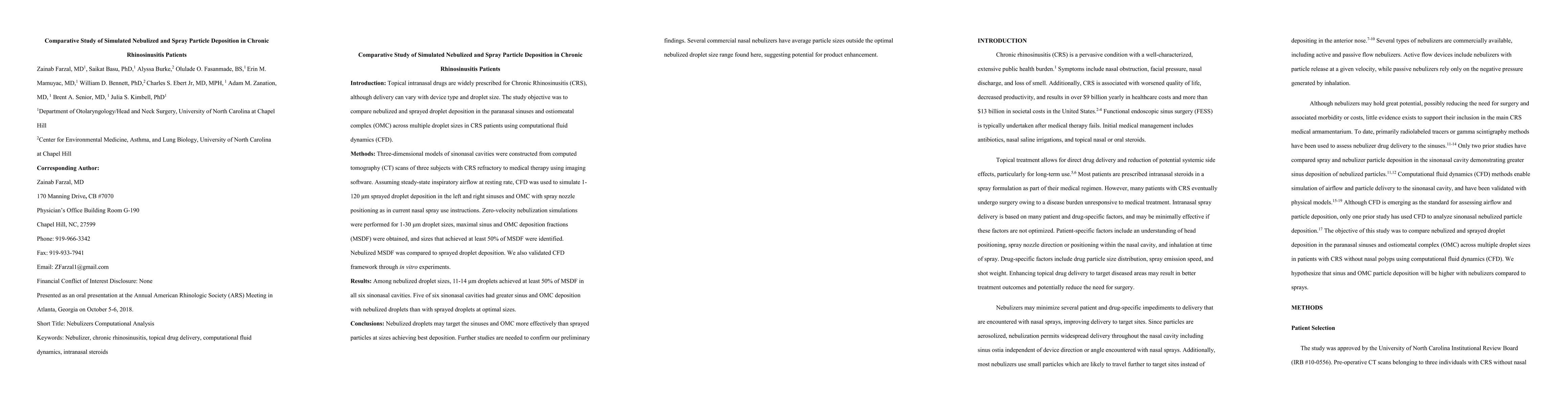 Nebulized droplets were found to target the sinuses and OMC more effectively than sprayed particles in patients with Chronic Rhinosinusitis, especially at optimal sizes of 11-14 microns.