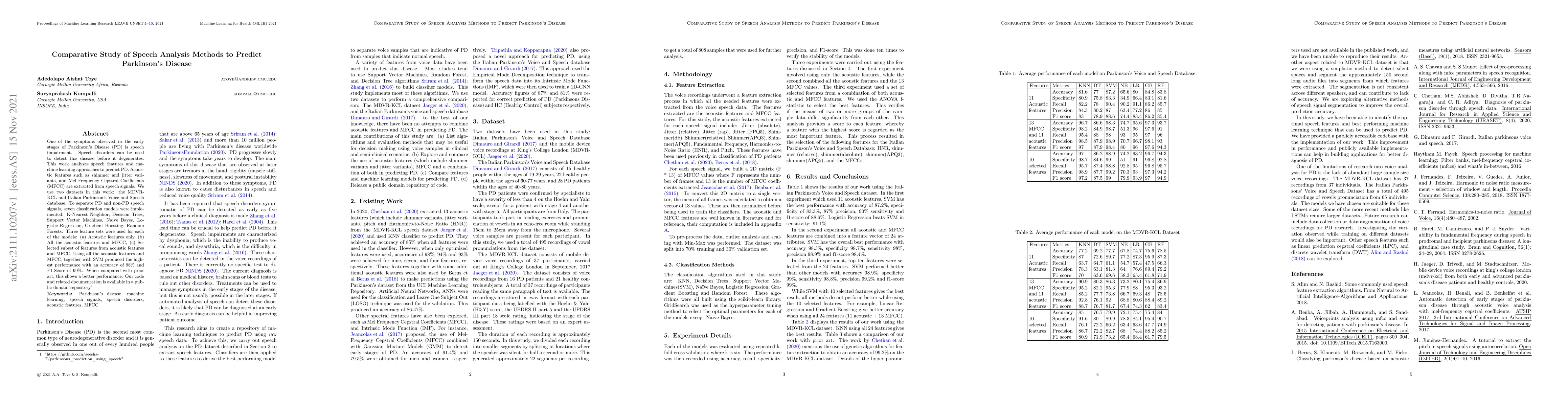 This study compares various machine learning methods to predict Parkinson's Disease using speech analysis, achieving 98% accuracy with Support Vector Machines using combined acoustic and MFCC features. The research utilizes two speech datasets and implements seven classification models, demonstrating superior performance over previous methods.