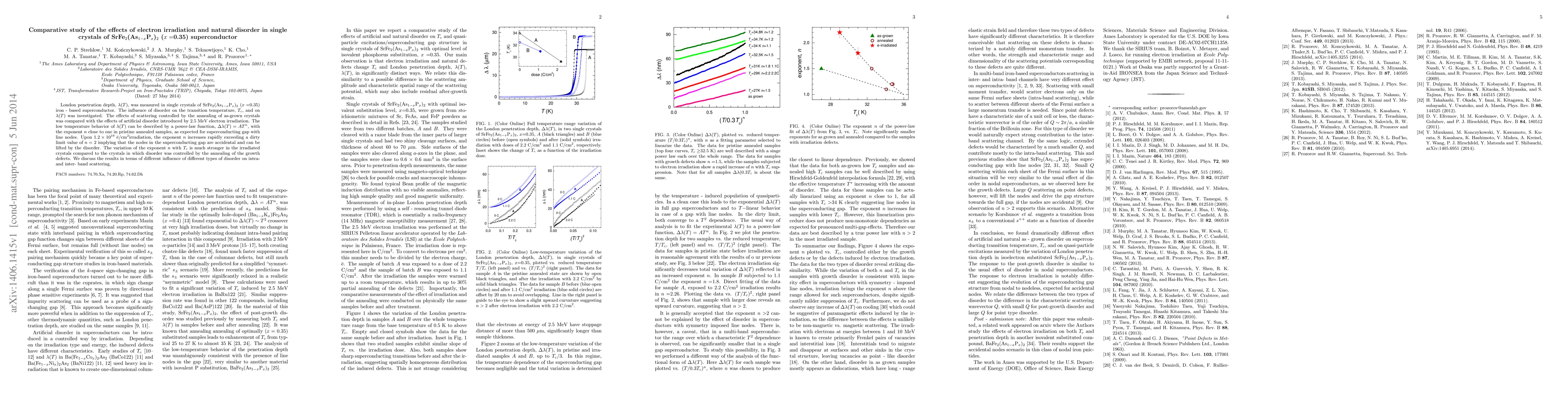 London penetration depth, $\lambda(T)$, was measured in single crystals of SrFe$_2$(As$_{1-x}$P$_x$)$_2$ ($x=$0.35) iron - based superconductor. The influence of disorder on the transition temperature, $T_c$, and on $\lambda(T)$ was investigated. The effects of scattering controlled by the annealing of as-grown crystals was compared with the effects of artificial disorder introduced by 2.5~MeV electron irradiation. The low temperature behavior of $\lambda(T)$ can be described by a power-law function, $\Delta \lambda (T)=AT^n$, with the exponent $n$ close to one in pristine annealed samples, as expected for superconducting gap with line nodes. Upon $1.2 \times 10^{19}$ \ecm irradiation, the exponent $n$ increases rapidly exceeding a dirty limit value of $n=$ 2 implying that the nodes in the superconducting gap are accidental and can be lifted by the disorder. The variation of the exponent $n$ with $T_c$ is much stronger in the irradiated crystals compared to the crystals in which disorder was controlled by the annealing of the growth defects. We discuss the results in terms of different influence of different types of disorder on intra- and inter- band scattering.