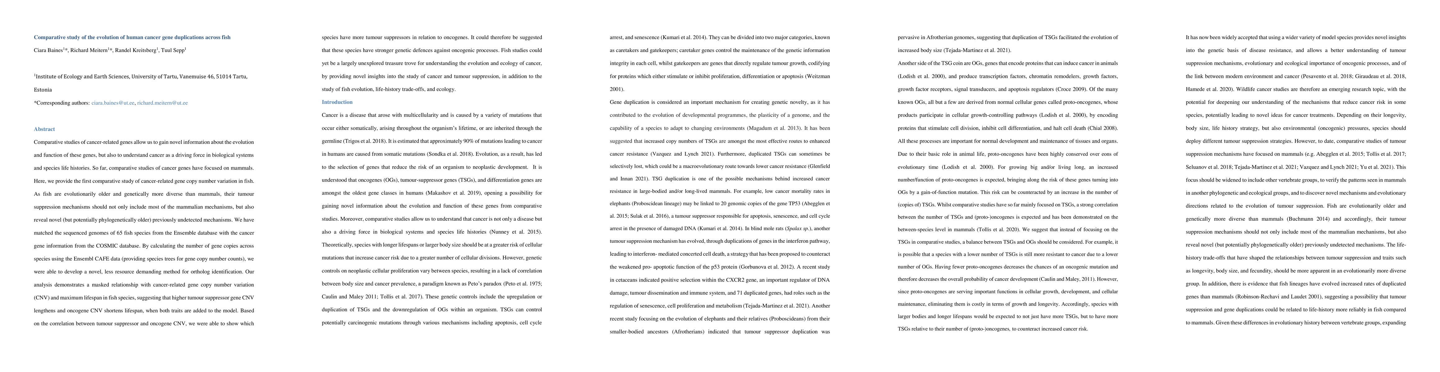 This study compares the evolution of cancer-related gene duplications across 65 fish species, revealing novel insights into tumour suppression mechanisms. It finds a correlation between cancer-related gene copy number variation and lifespan, suggesting that higher tumour suppressor gene CNV extends lifespan while oncogene CNV reduces it.