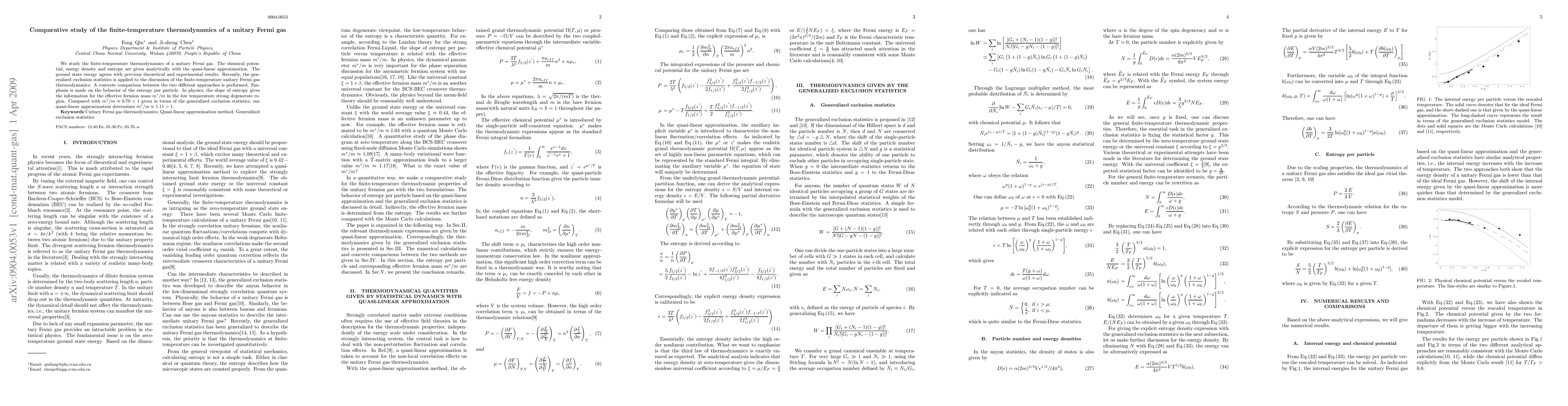 This paper presents an analytical study of the finite-temperature thermodynamics of a unitary Fermi gas using quasi-linear approximation, comparing it with results from generalized exclusion statistics. The entropy per particle and effective fermion mass $m^*/m$ are found to differ significantly between the two approaches.