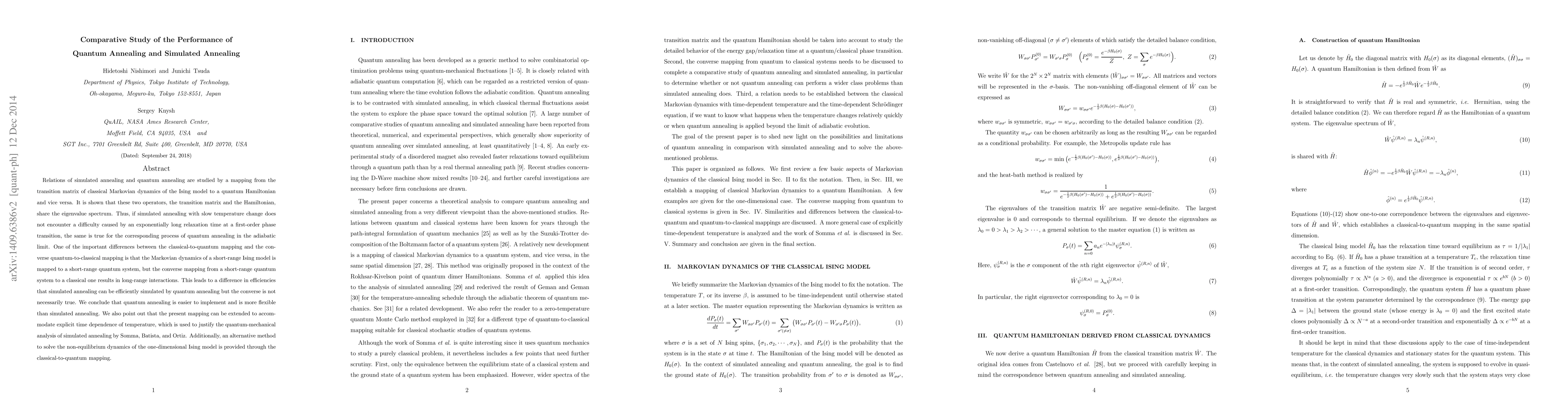 This paper compares quantum annealing and simulated annealing, showing that both share an eigenvalue spectrum, indicating similar performance in the adiabatic limit. It highlights that quantum annealing is more efficient and flexible, especially for short-range Ising models, while classical systems can simulate quantum processes but not vice versa.