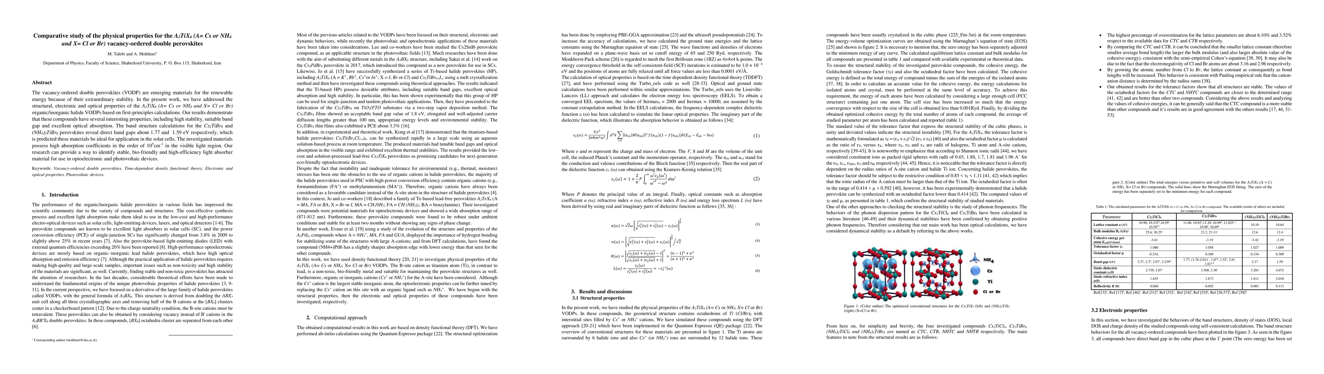 This study investigates the structural, electronic, and optical properties of vacancy-ordered double perovskites A$_2$TiX$_6$ (A= Cs or NH$_4$; X= Cl or Br) using first-principles calculations. The findings suggest these materials exhibit high stability, suitable band gaps, and excellent optical absorption, making them promising candidates for solar cell applications.