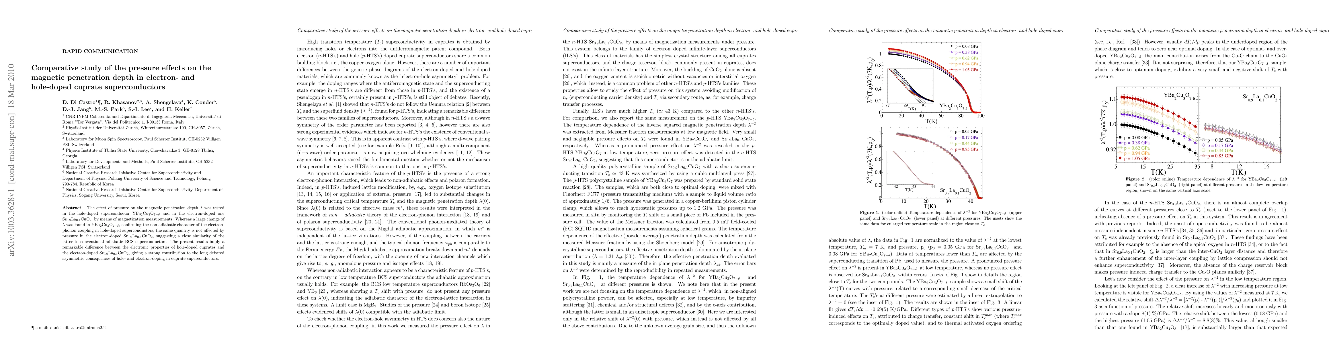 This study investigates the impact of pressure on magnetic penetration depth in hole-doped YBa2Cu3O(7-d) and electron-doped Sr0.9La0.1CuO2 superconductors, revealing significant differences in their electronic properties. Pressure notably alters $\lambda$ in the hole-doped material, indicating non-adiabatic electron-phonon coupling, while it remains unaffected in the electron-doped one, suggesting conventional BCS behavior.