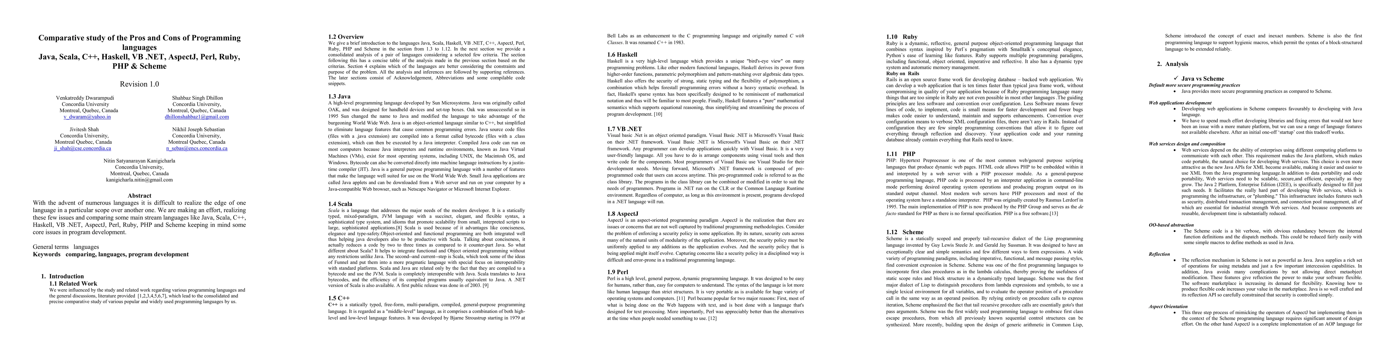 With the advent of numerous languages it is difficult to realize the edge of one language in a particular scope over another one. We are making an effort, realizing these few issues and comparing some main stream languages like Java, Scala, C++, Haskell, VB .NET, AspectJ, Perl, Ruby, PHP and Scheme keeping in mind some core issues in program development.