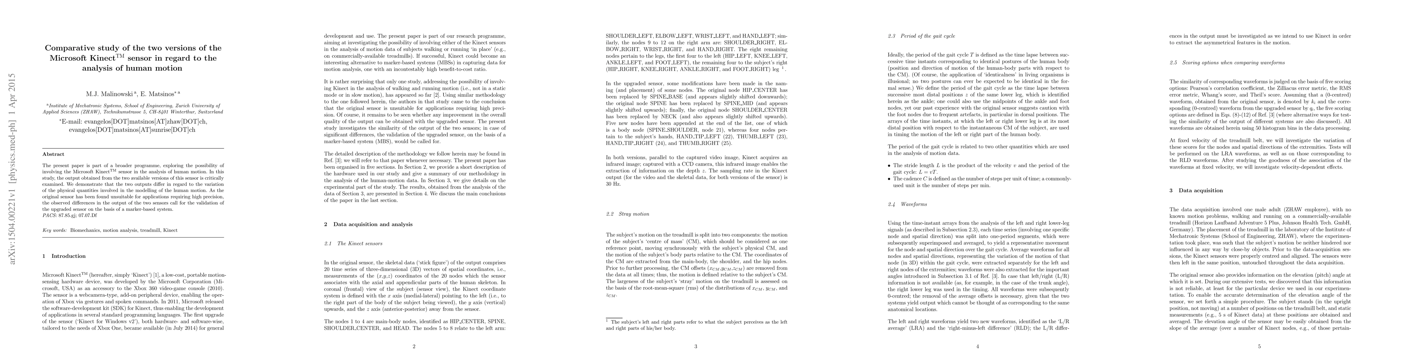The present paper is part of a broader programme, exploring the possibility of involving the Microsoft Kinect$^{\rm TM}$ sensor in the analysis of human motion. In this study, the output obtained from the two available versions of this sensor is critically examined. We demonstrate that the two outputs differ in regard to the variation of the physical quantities involved in the modelling of the human motion. As the original sensor has been found unsuitable for applications requiring high precision, the observed differences in the output of the two sensors call for the validation of the upgraded sensor on the basis of a marker-based system.