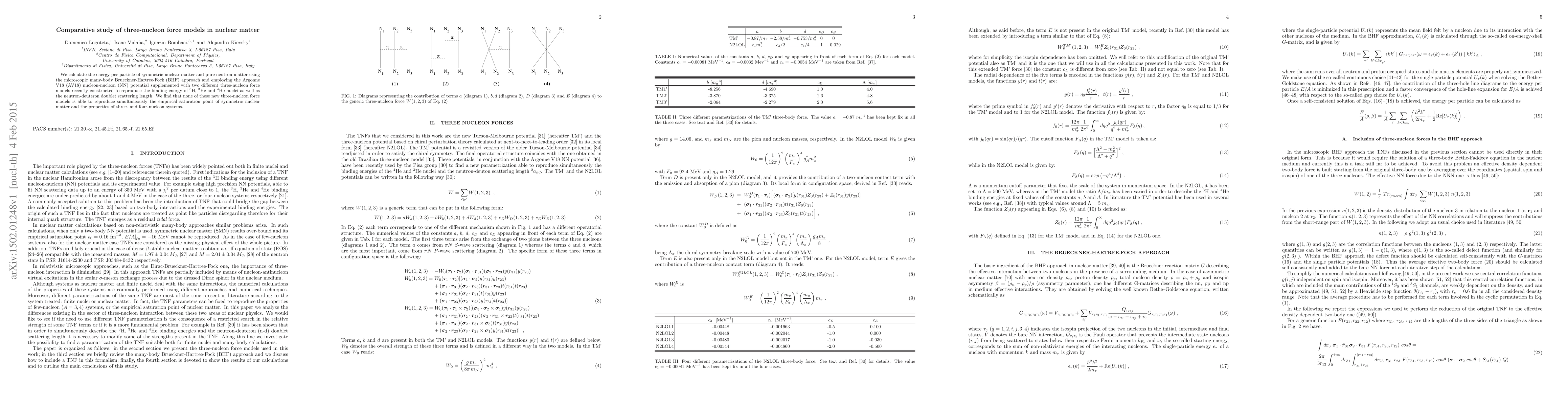 This study compares three-nucleon force models in nuclear matter using the BHF approach and the AV18 potential, finding that none of the models can simultaneously reproduce the empirical saturation point and properties of light nuclei.