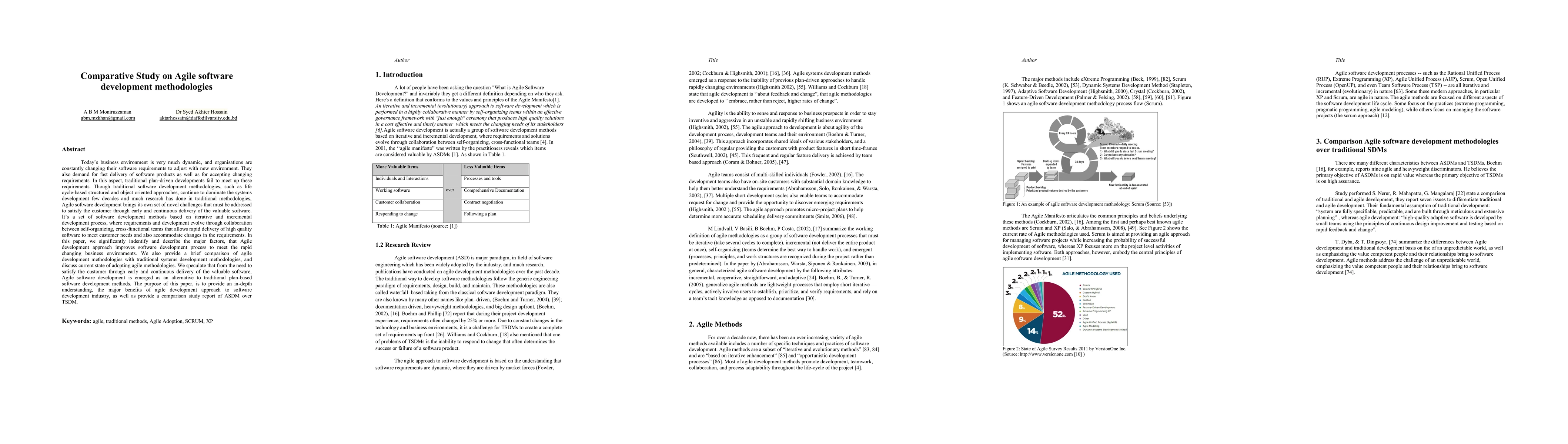 This paper explores how Agile software development methodologies, based on iterative and incremental processes, improve the software development lifecycle to meet dynamic business needs. It compares Agile approaches with traditional plan-driven methods, highlighting the benefits of Agile in accommodating changes and delivering high-quality software rapidly.