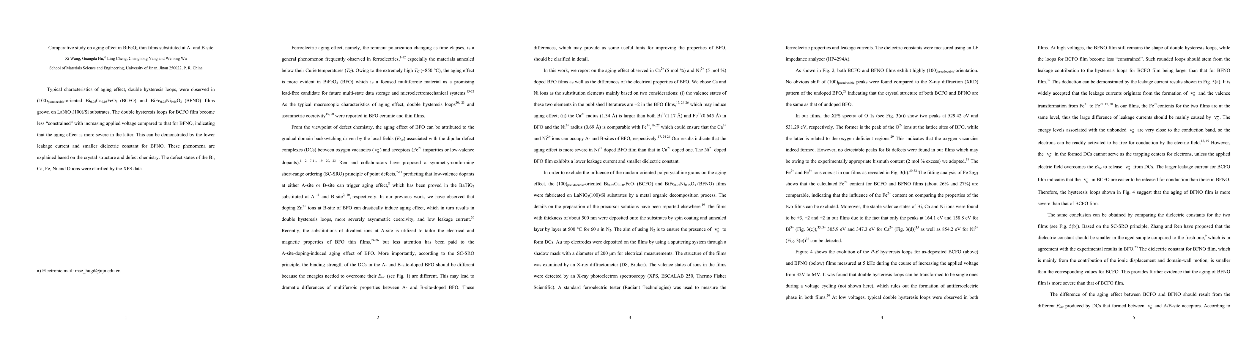A comparative study on Bi0.95Ca0.05FeO3 (BCFO) and BiFe0.95Ni0.05O3 (BFNO) thin films revealed distinct aging effects, characterized by double hysteresis loops. BCFO films showed a less constrained hysteresis with increasing voltage, suggesting a more severe aging effect in BFNO, attributed to differences in crystal structure and defect chemistry, as supported by XPS data.