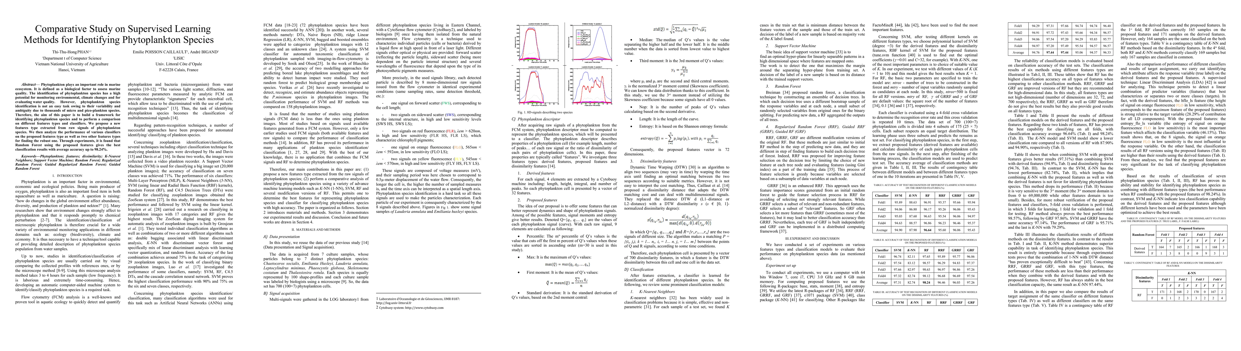This paper develops a framework for identifying phytoplankton species using supervised learning methods, comparing various feature types and classifiers. The proposed method, utilizing a new feature type extracted from raw signals, achieves an average accuracy of 98.24% with Random Forest, outperforming other classifiers.